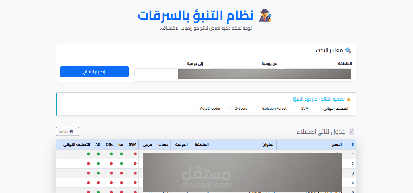 صفحه web تقدر من خلالها تصنف العملاء على حسب احتماليه السرقه