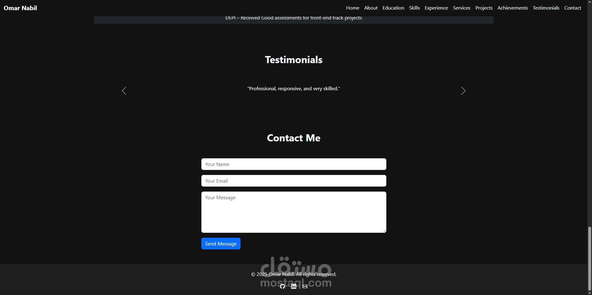 التوصيات ونموذج الاتصال: قسم يعرض آراء العملاء ونموذج تواصل مباشر وسهل الاستخدام (Contact Me Form).