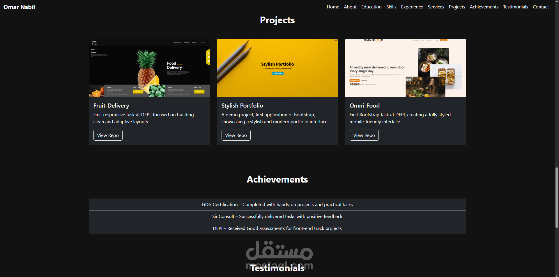المشاريع: عرض المشاريع الرئيسية (مثل Food Delivery، Omni-Food) مع معاينات بصرية وروابط لمشاهدة التفاصيل.