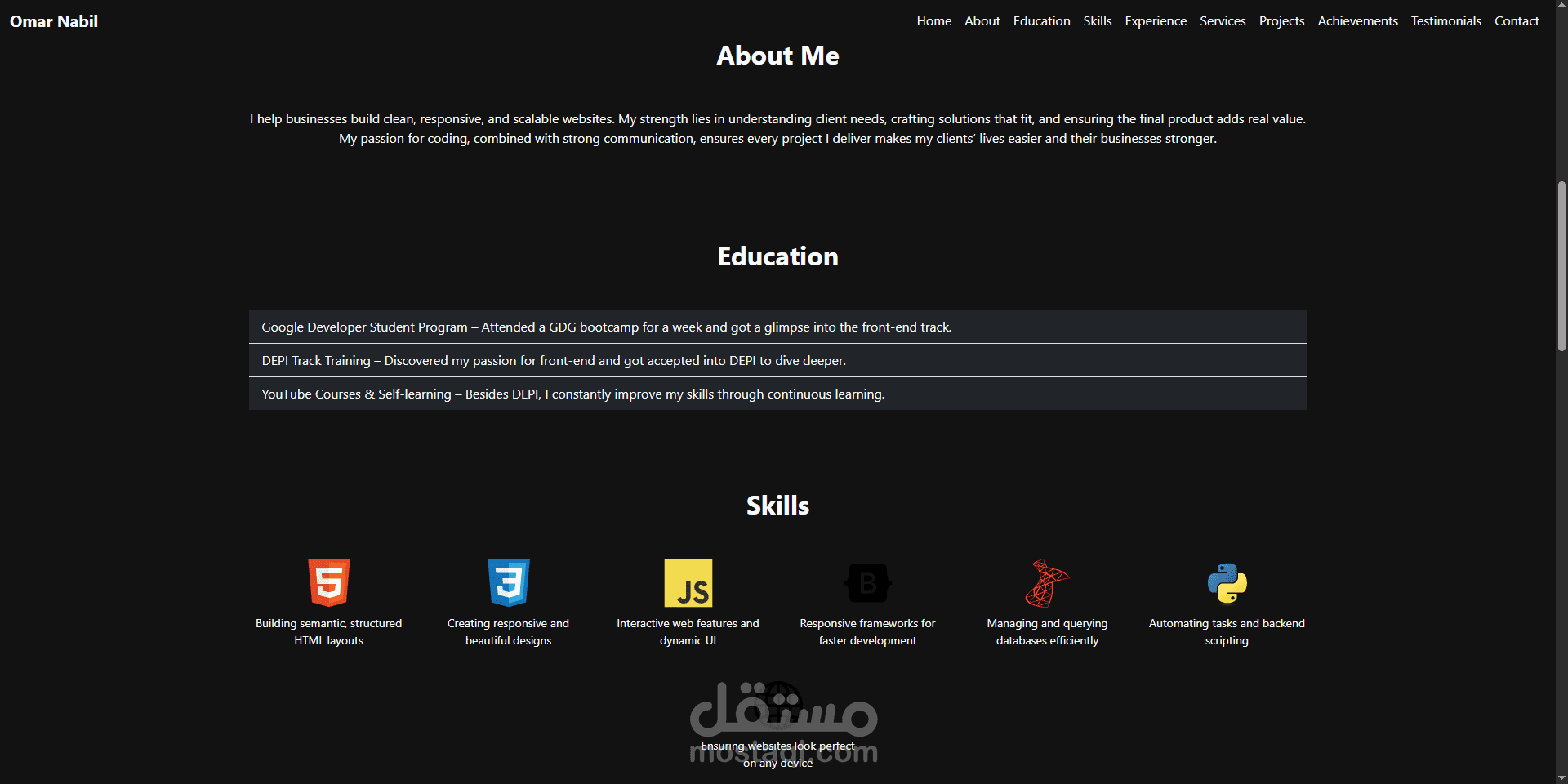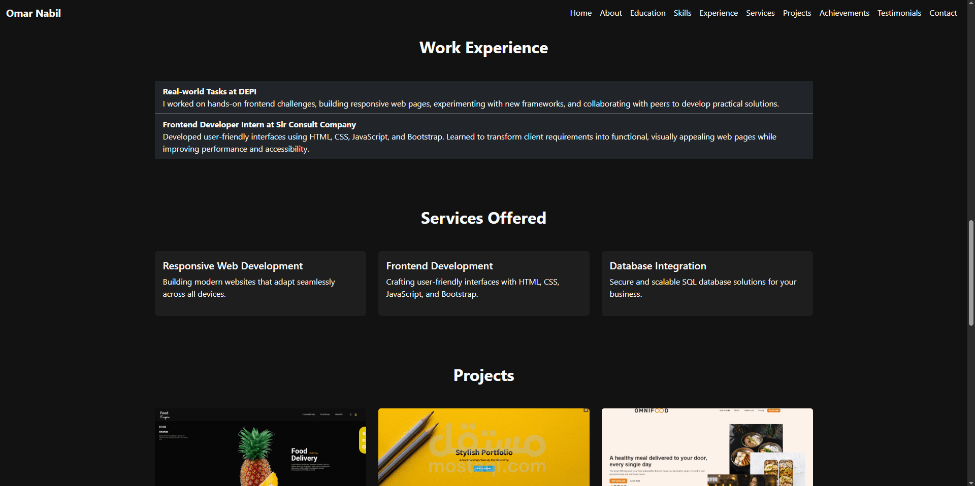 الخبرة والخدمات: لعرض الخبرة العملية والخدمات المقدمة (Responsive Web Development, Frontend Development, Database Integration).