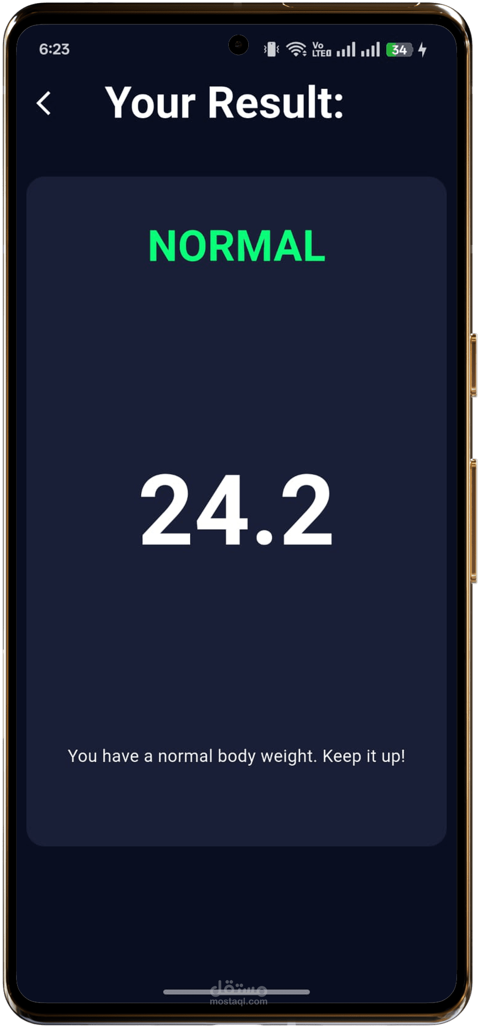 عرض نتيجة BMI مع تقييم المستخدم (نحيف، طبيعي، زيادة وزن، سمنة).