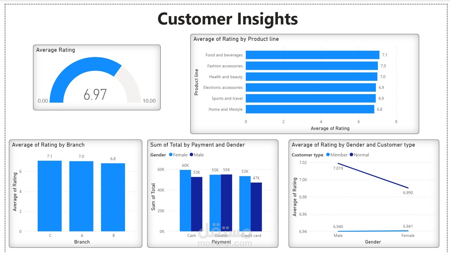 2.تحديد مؤشرات الأداء الرئيسية (KPIs): تم تحديد مجموعة شاملة من مؤشرات الأداء الرئيسية التي تغطي جوانب مختلفة من أداء السوبر ماركت، مثل إجمالي المبيعات، الكمية المباعة، الدخل الإجمالي، متوسط التقييم، والمبيعات حسب خط الإنتاج والفرع ونوع العميل والجنس وطريقة الدفع.