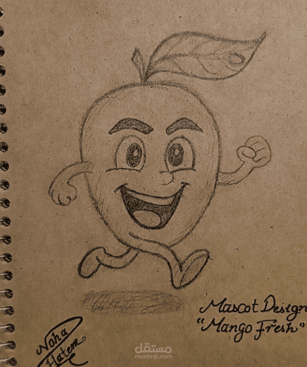 الرسم الأولي (Sketching): بدأت برسم الشخصية يدويًا على ورق كرافت، مع التركيز على إبراز ملامحها المرحة والحيوية التي تعكس اسم "Mango Fresh".