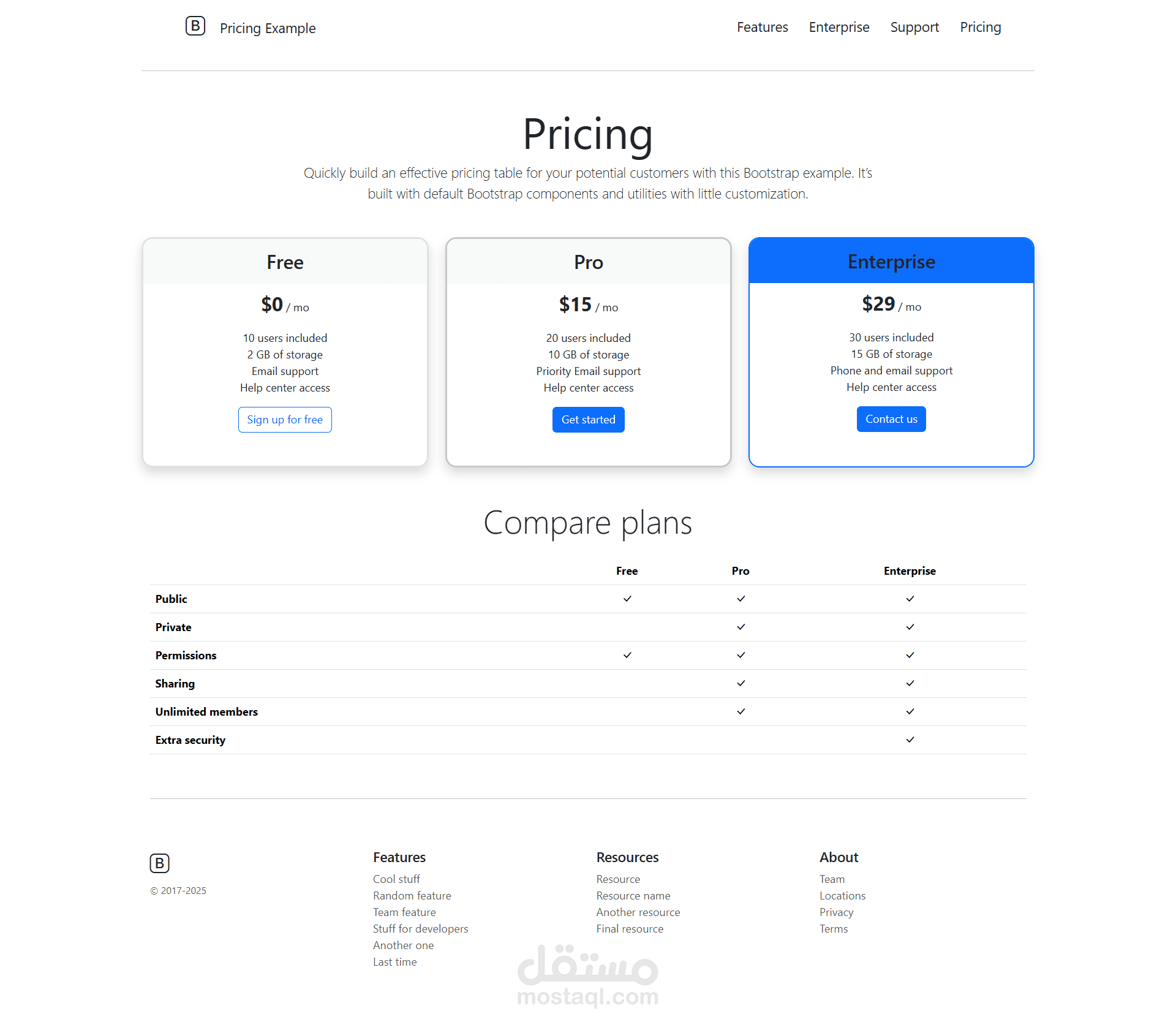 قمت بتصميم وتطوير صفحة Pricing احترافية باستخدام إطار العمل Bootstrap 5 لعرض الباقات والخطط بشكل منظم وواضح.