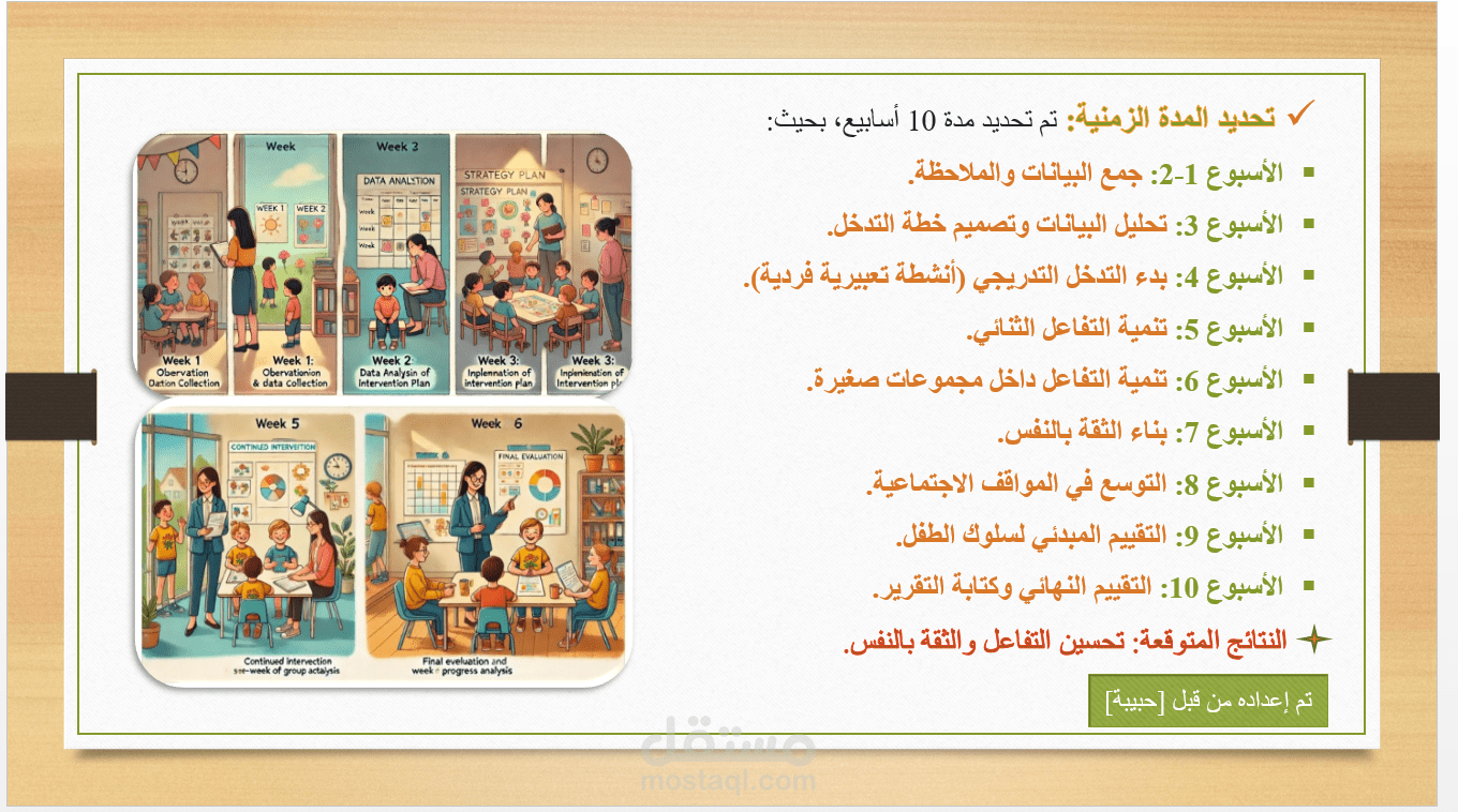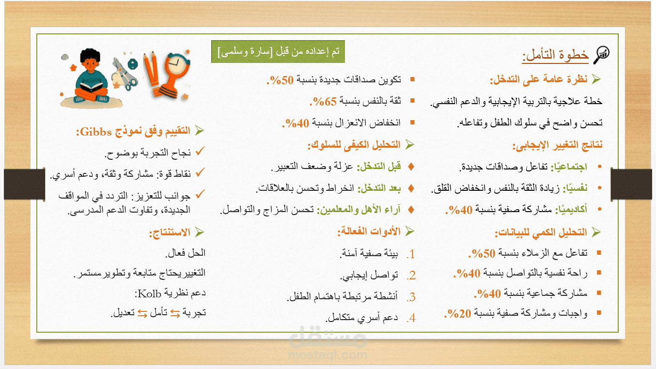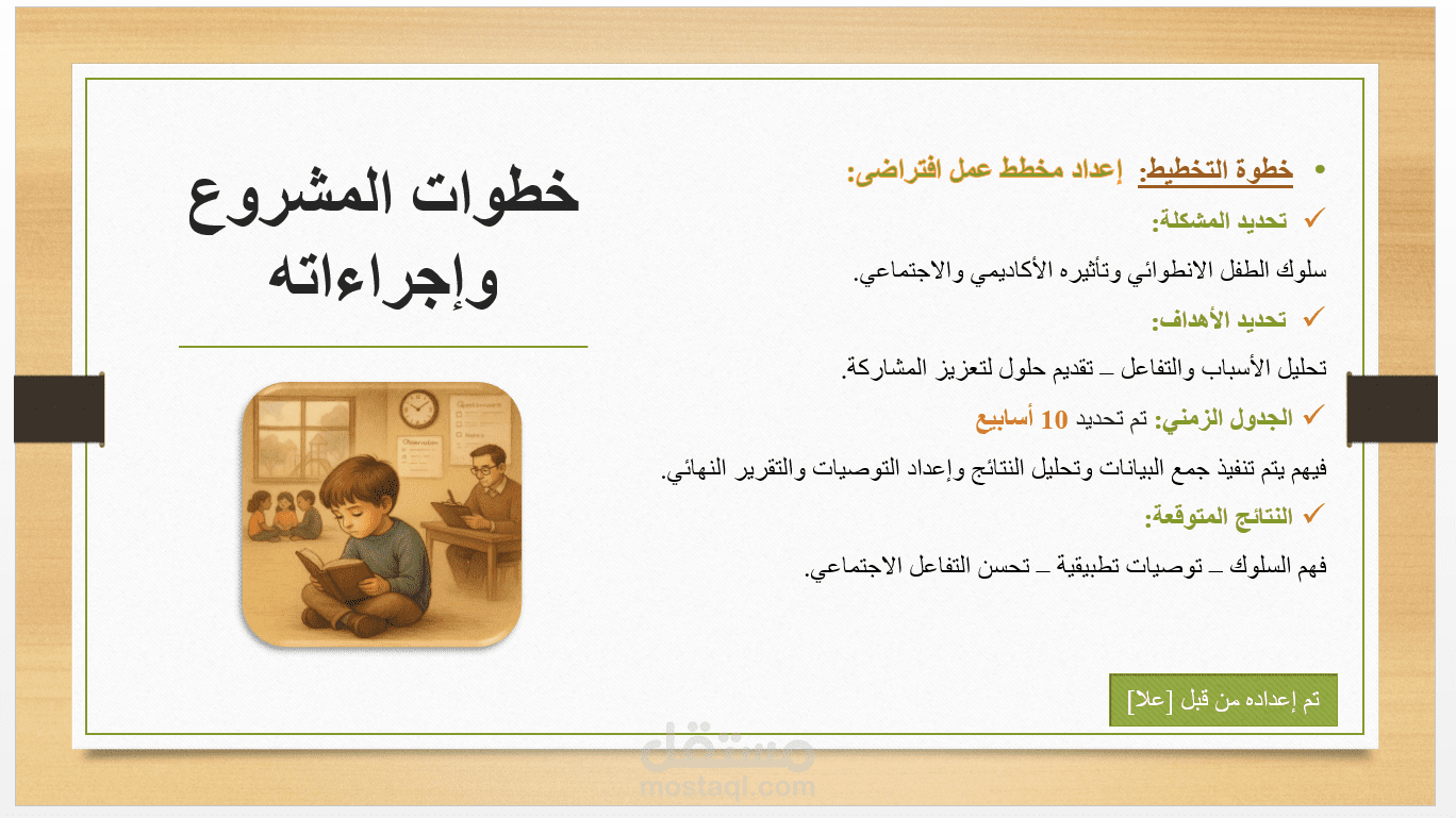 تمت الخطوات بدءًا من رصد المشكلة والتأكد من وجودها، ثم تحديد أهداف المشروع المتمثلة في تعزيز التفاعل والمشاركة الاجتماعية للطفل، وتقليل مظاهر الانعزال والخجل سواء في المدرسة أو المنزل.