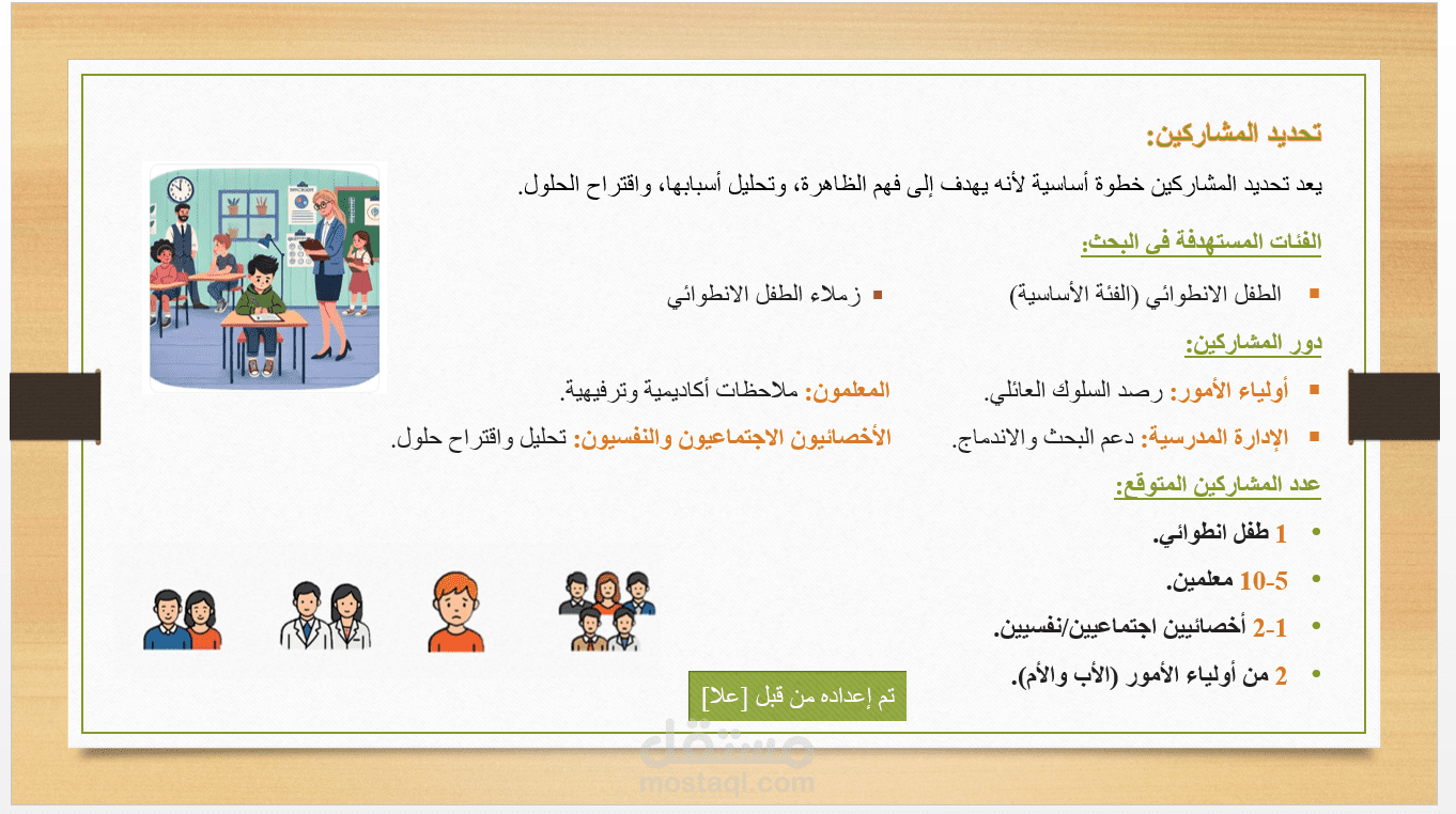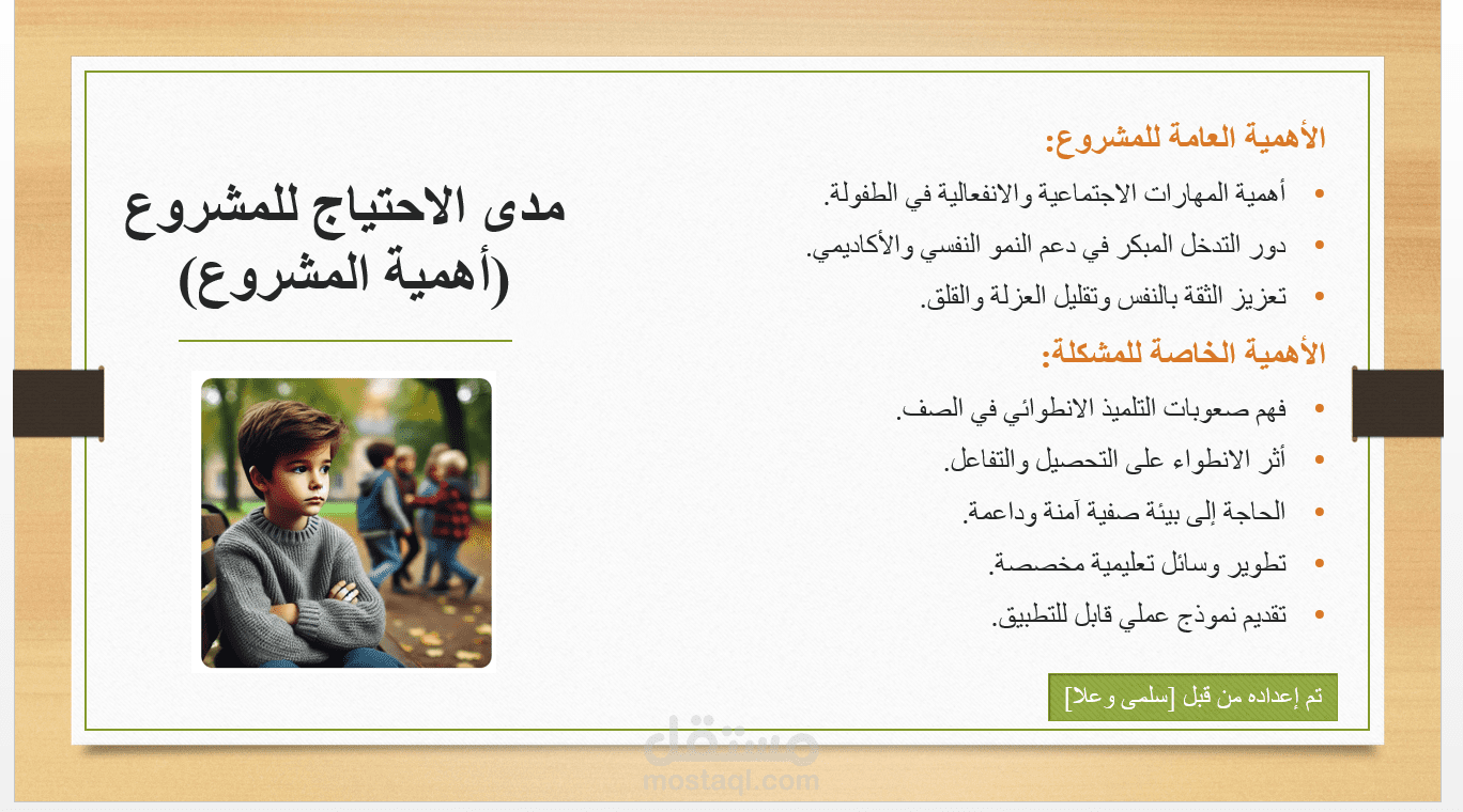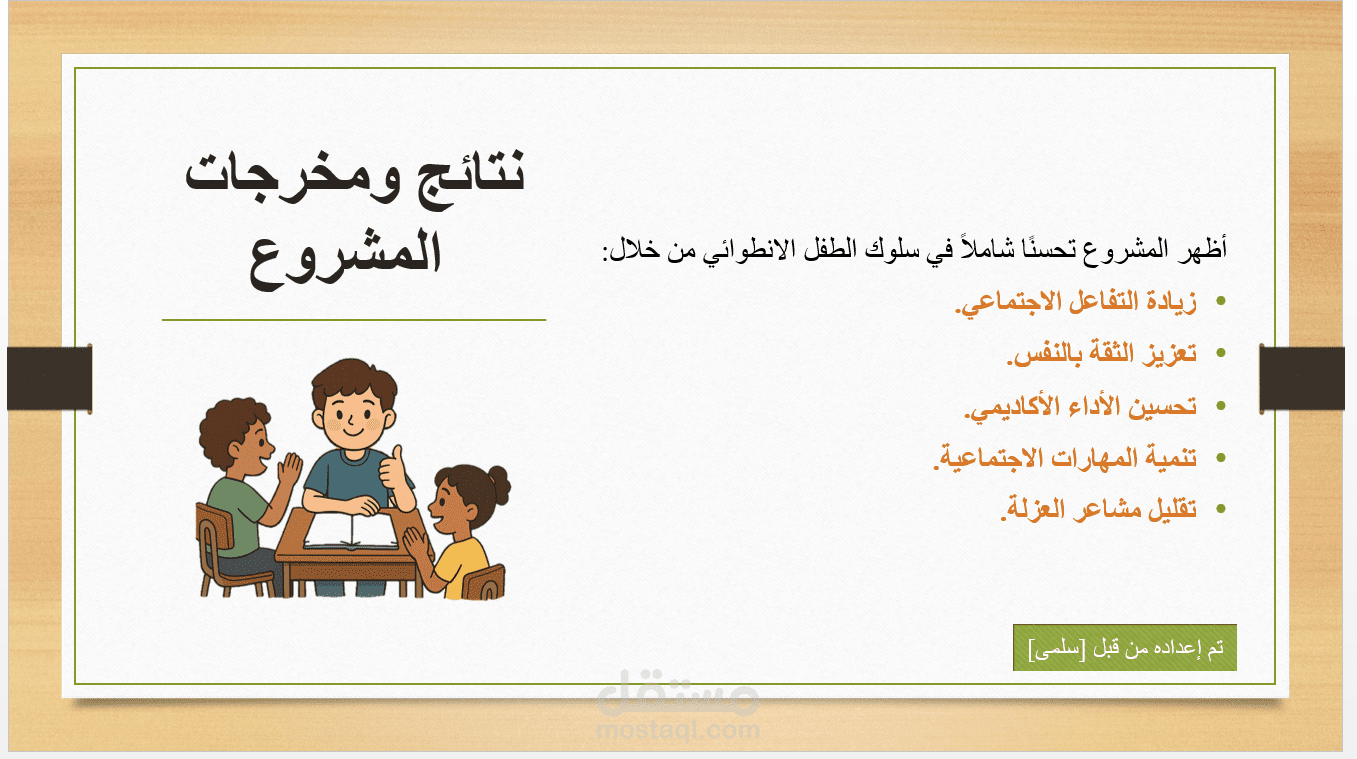 تمت الخطوات بدءًا من رصد المشكلة والتأكد من وجودها، ثم تحديد أهداف المشروع المتمثلة في تعزيز التفاعل والمشاركة الاجتماعية للطفل، وتقليل مظاهر الانعزال والخجل سواء في المدرسة أو المنزل.