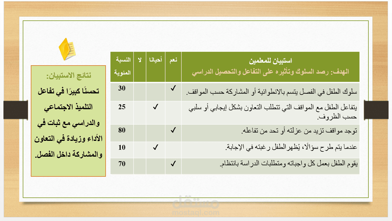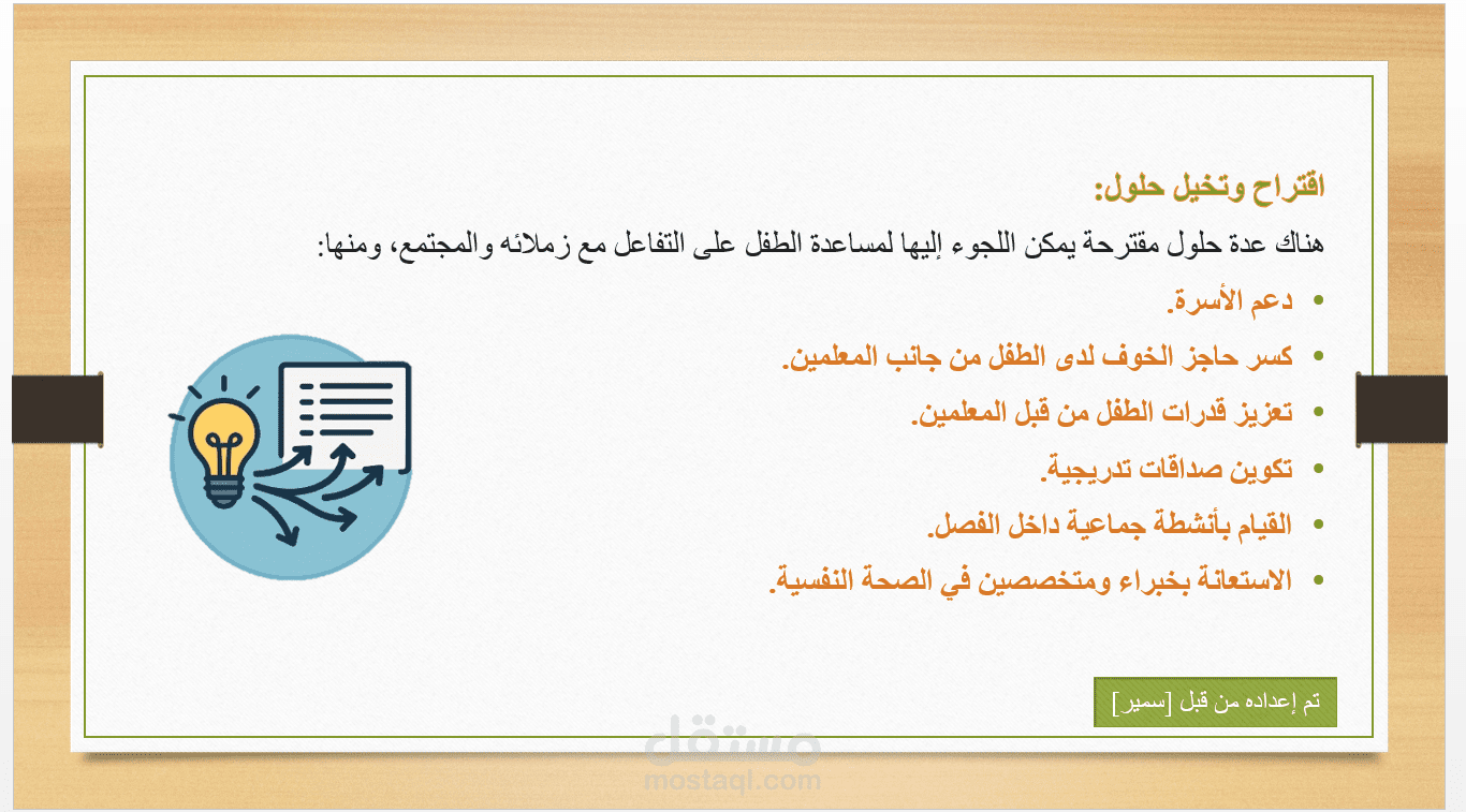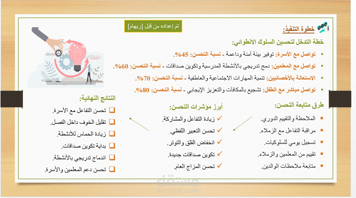 تم تنفيذ الحلول عمليًا من خلال التعاون بين الأسرة والمعلمين والأخصائيين، ومتابعة تطور سلوك الطفل عبر الملاحظة المستمرة والاستبيانات الدورية.
