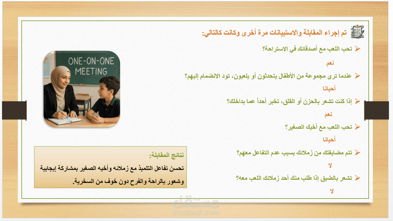 أظهرت النتائج تحسنًا واضحًا في تفاعل الطفل وثقته بنفسه، حيث بدأ يشارك في الحديث والأنشطة، وتقلصت مظاهر القلق والانطواء.