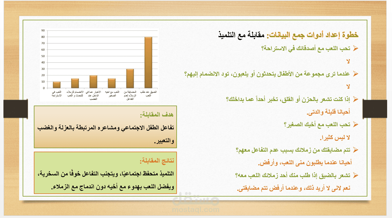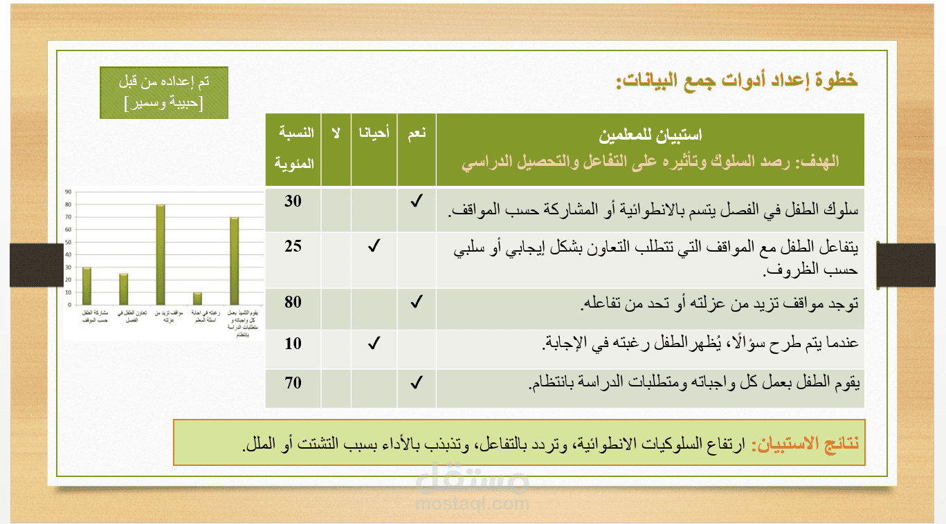 استخدمت أدوات متنوعة لجمع البيانات مثل الاستبيانات وسجلات الحضور والدرجات، بمشاركة كل من الطفل، أولياء الأمور، المعلمين، والأخصائيين الاجتماعيين.