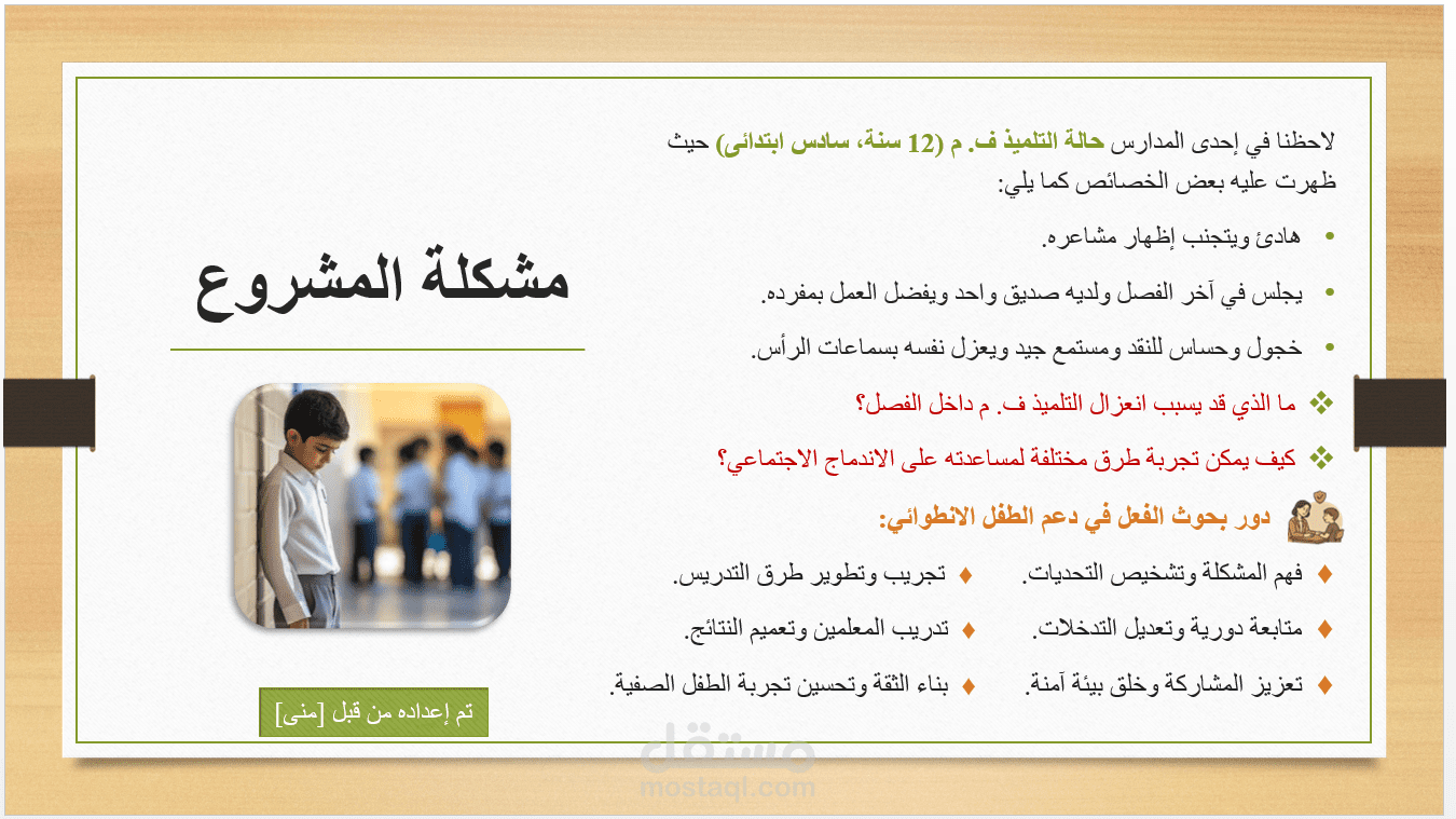 يهدف المشروع إلى مساعدة تلميذ في الصف السادس الابتدائي (ف.م) يعاني من سلوك انطوائي باستخدام نموذج أوليري الدائري في دراسة الحالة.