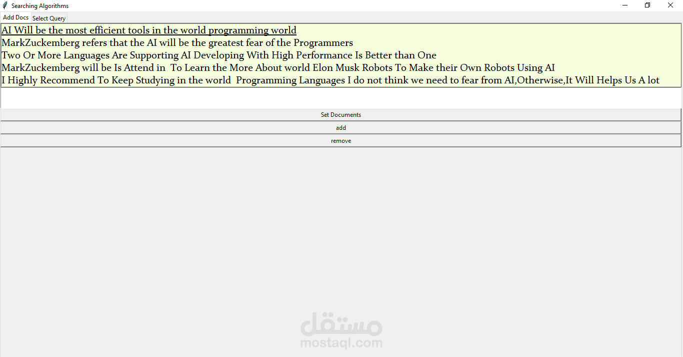 الصورة الأولى: تظهر الواجهة الرئيسية مع حقل البحث ("Searching Algorithms") وعرض المستندات المحملة من الـ PDF، مثل: "AI Will be the most efficient tool in the world programming world" و"MarkZuckemberg refers that the AI will be the greatest fear..."، بالإضافة إلى خيارات إدارة المستندات (Set Documents: Add, Remove).