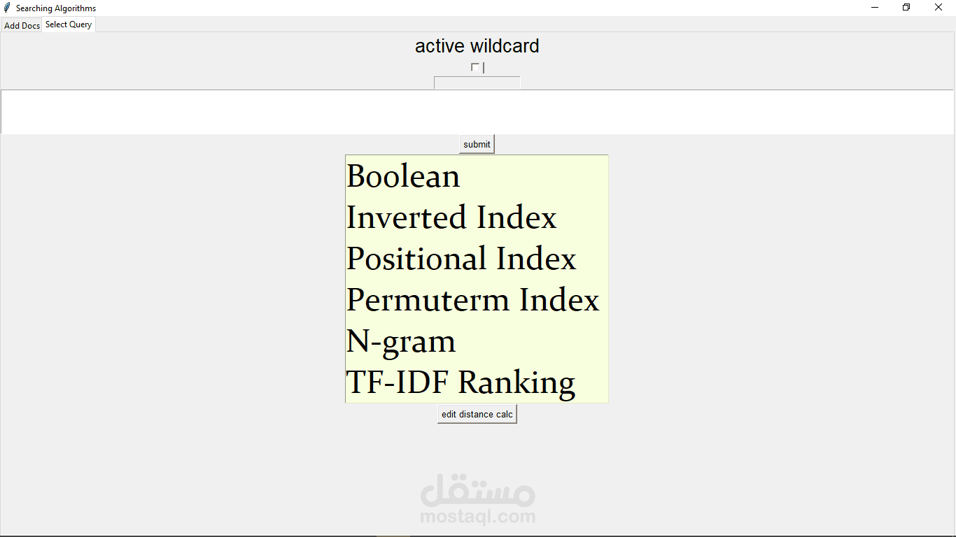الصورة الثانية: تعرض قائمة الخوارزميات المتاحة تحت "Active Wildcard"، مع زر "Submit" لتنفيذ البحث، وقائمة تشمل Boolean، Inverted Index، Positional Index، Permuterm Index، N-gram، TF-IDF Ranking، وزر لحساب مسافة التحرير (Edit Distance Calc).