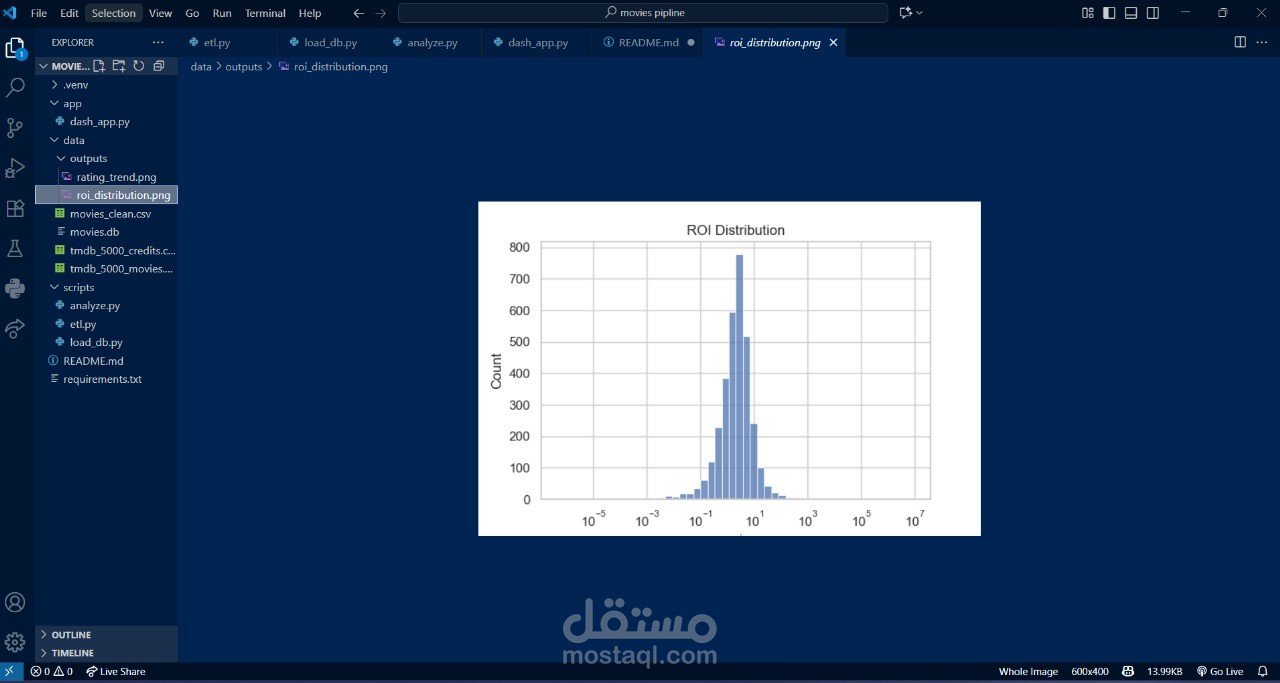 يقوم المشروع بجمع بيانات الأفلام الخام ، ثم معالجتها من خلال نظام ETL يتضمن تنظيف البيانات، حساب العائد على الاستثمار (ROI)، واستخراج نوع الفيلم الرئيسي، قبل تخزينها في قاعدة بيانات SQLite.