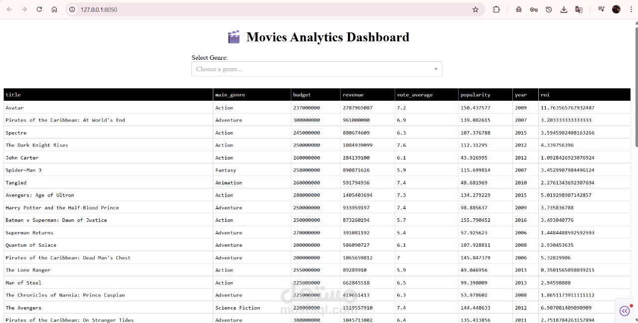 أخيرًا، تم إنشاء لوحة تحكم تفاعلية باستخدام Dash لعرض النتائج بشكل مرئي، تشمل تصفية الأفلام حسب النوع، جداول تفاعلية، ورسوم بيانية (أعمدة ومبعثرة).