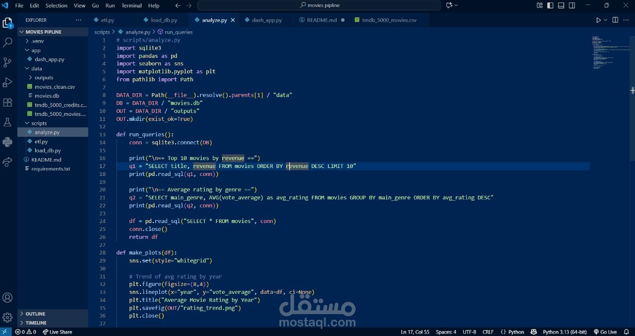 قمت بتطوير نظام متكامل لتحليل بيانات الأفلام (Movies Analytics Data Pipeline) باستخدام Python، SQL، وDash.
