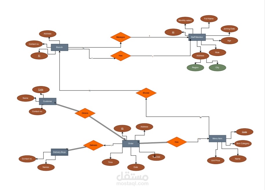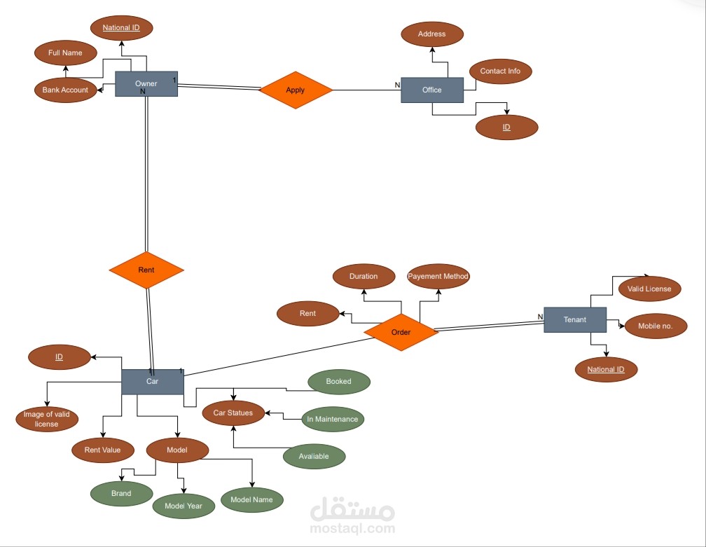 يوضّح المخطط العلاقات بين الكيانات الأساسية مثل: