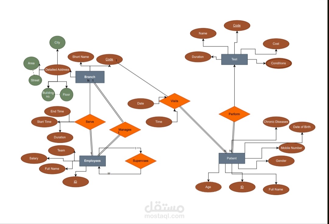 يساعد هذا النموذج في بناء قاعدة بيانات منظمة لإدارة بيانات المرضى والفحوصات والموظفين والفروع بكفاءة.