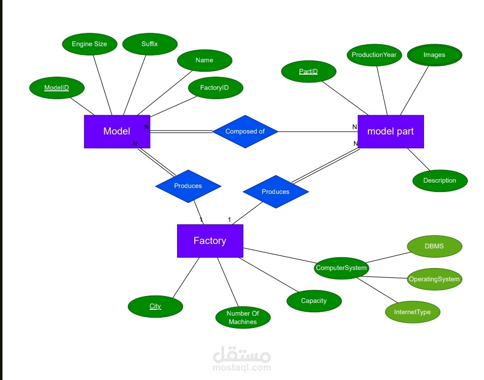 المصنع (Factory): يحتوي على بيانات مثل المدينة، السعة الإنتاجية، عدد الآلات، ونظام الحاسب المستخدم.
