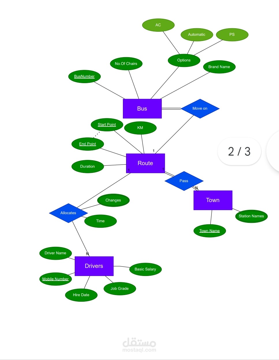 يمثل هذا المخطط قاعدة بيانات لشركة حافلات، ويتضمن: