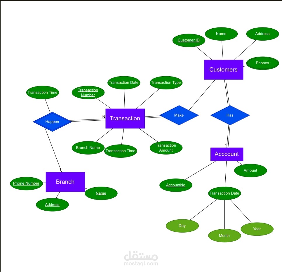 الحسابات (Account): يحتوي على رقم الحساب، الرصيد، وتاريخ المعاملة.