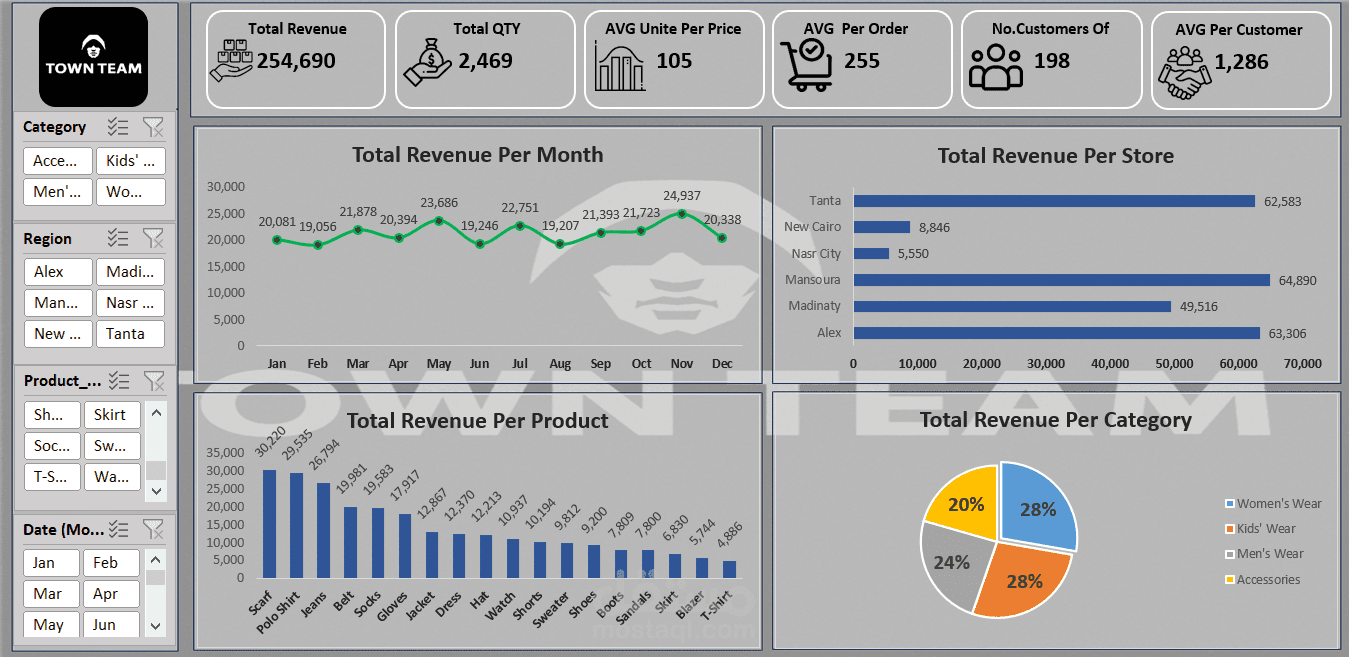 كشف اتجاهات السوق: نجح المشروع في تحليل الأداء على محورين رئيسيين: تتبع النمو الشهري لتحديد فترات الذروة، وتقييم أداء كل متجر ومنطقة لتوجيه الموارد بذكاء.