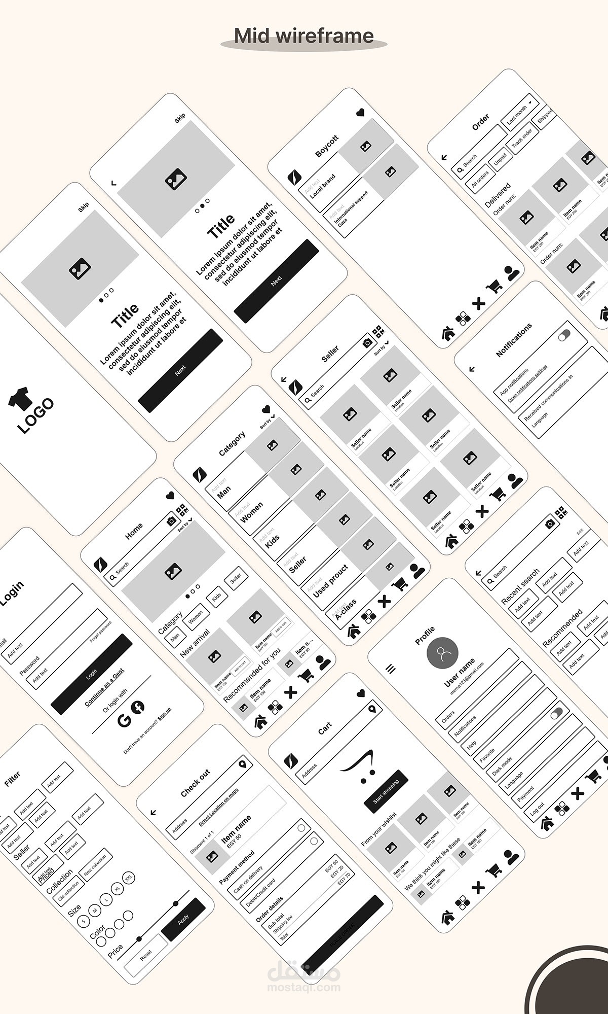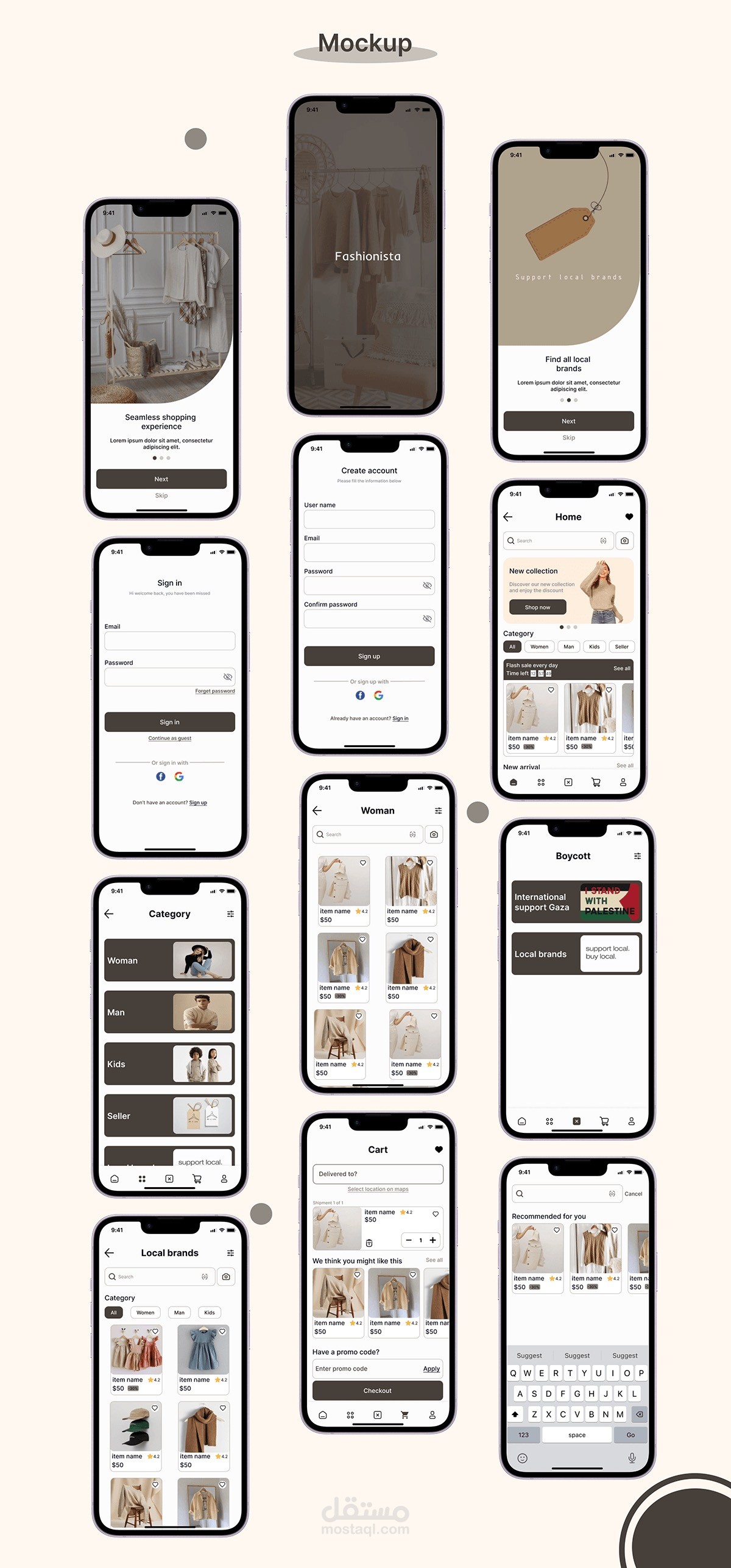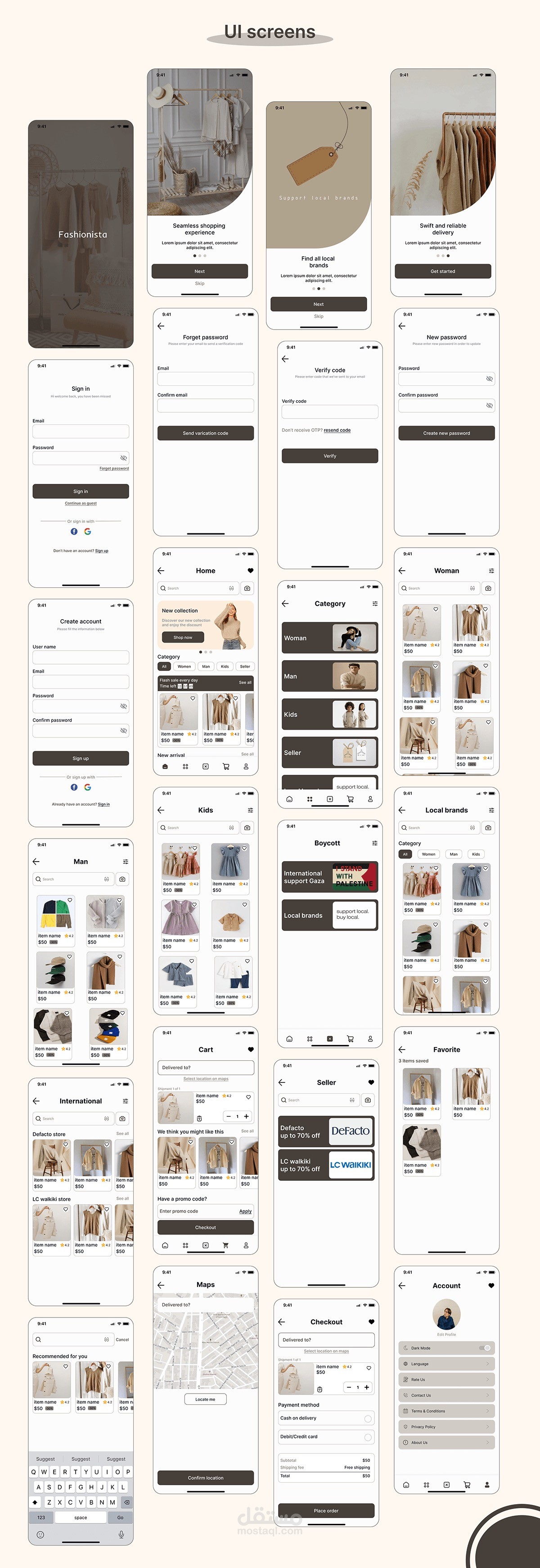 يتميز بتصميم أنيق يجمع بين الألوان الهادئة (بيج، أبيض، وبني) التي تعكس طابع الموضة العصري والفخم، مع تجربة مستخدم سلسة ومنظمة.