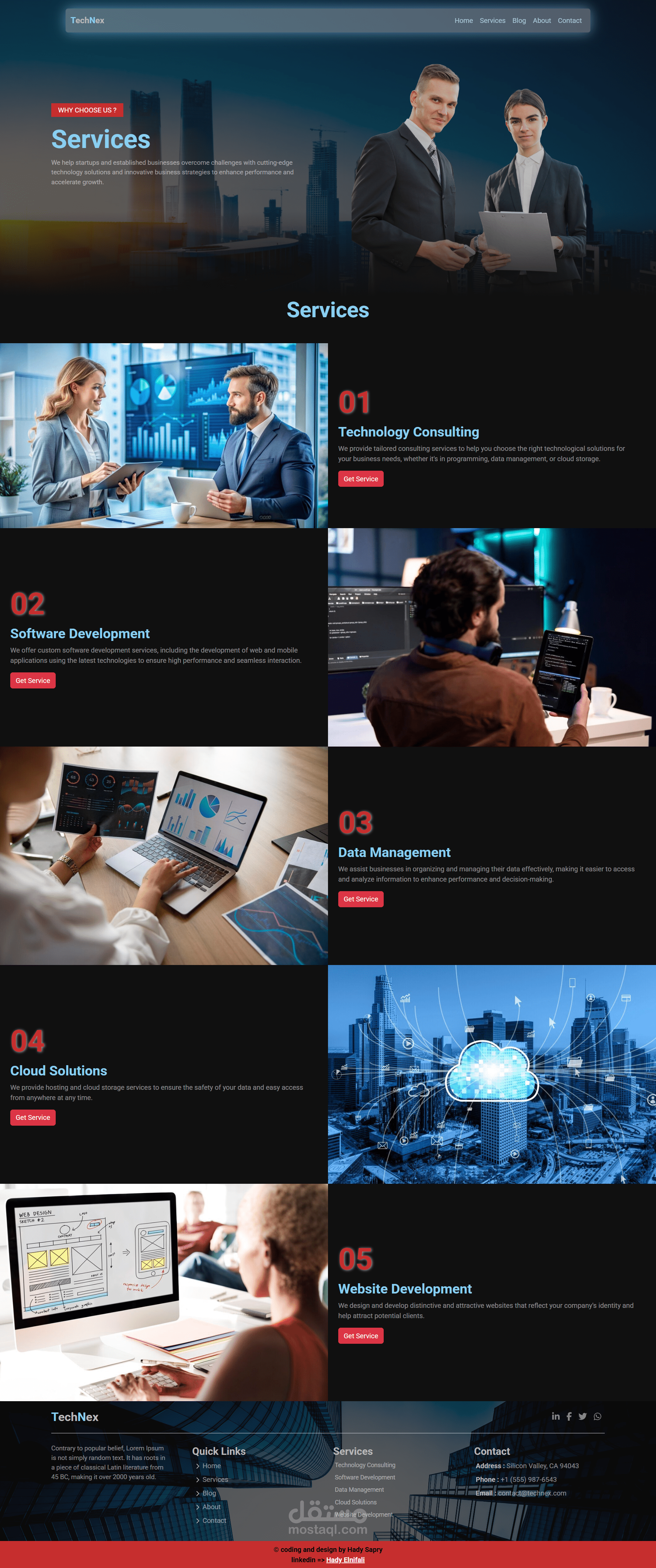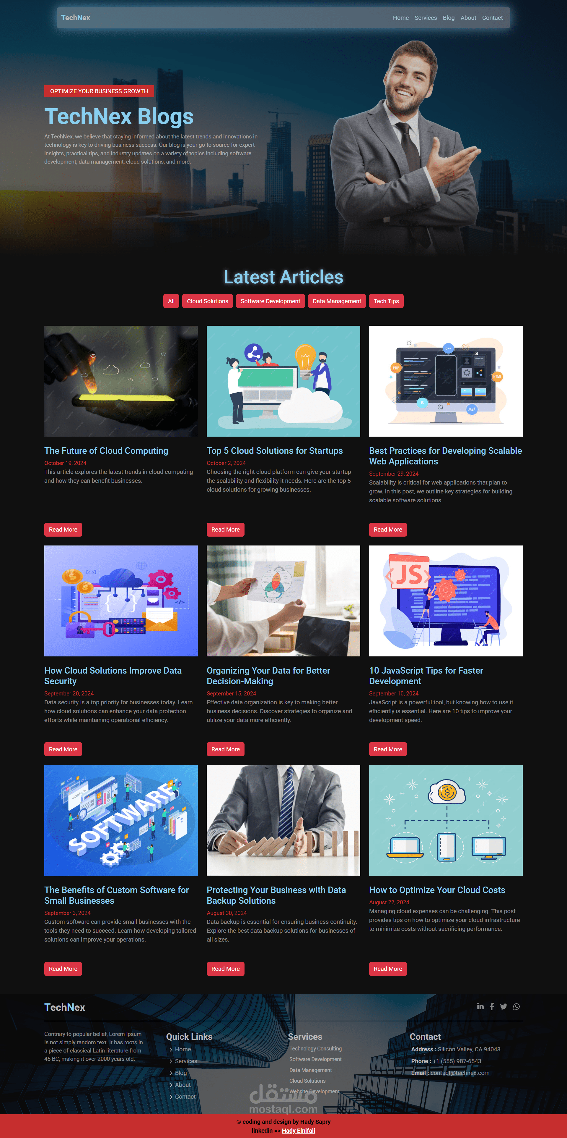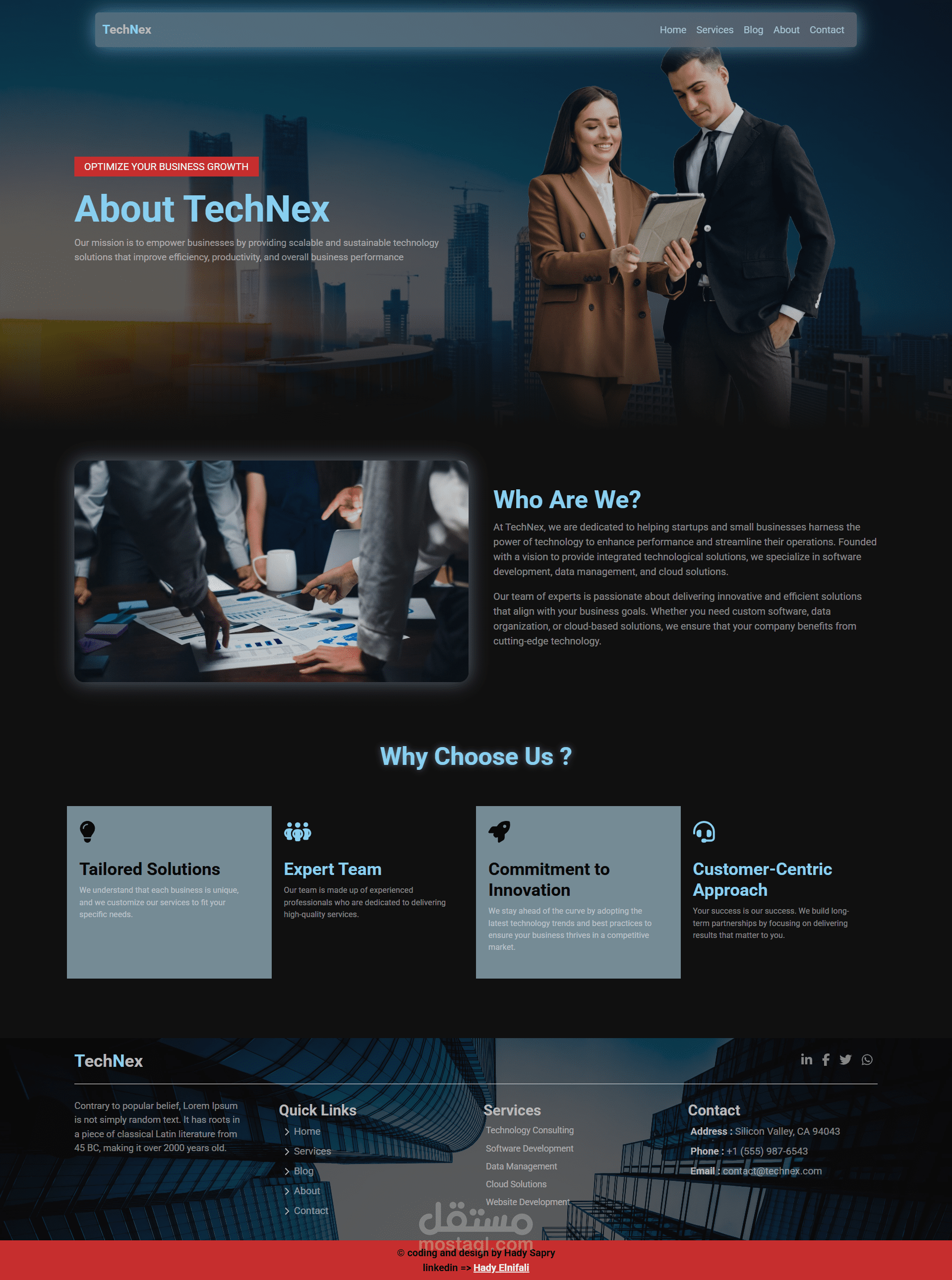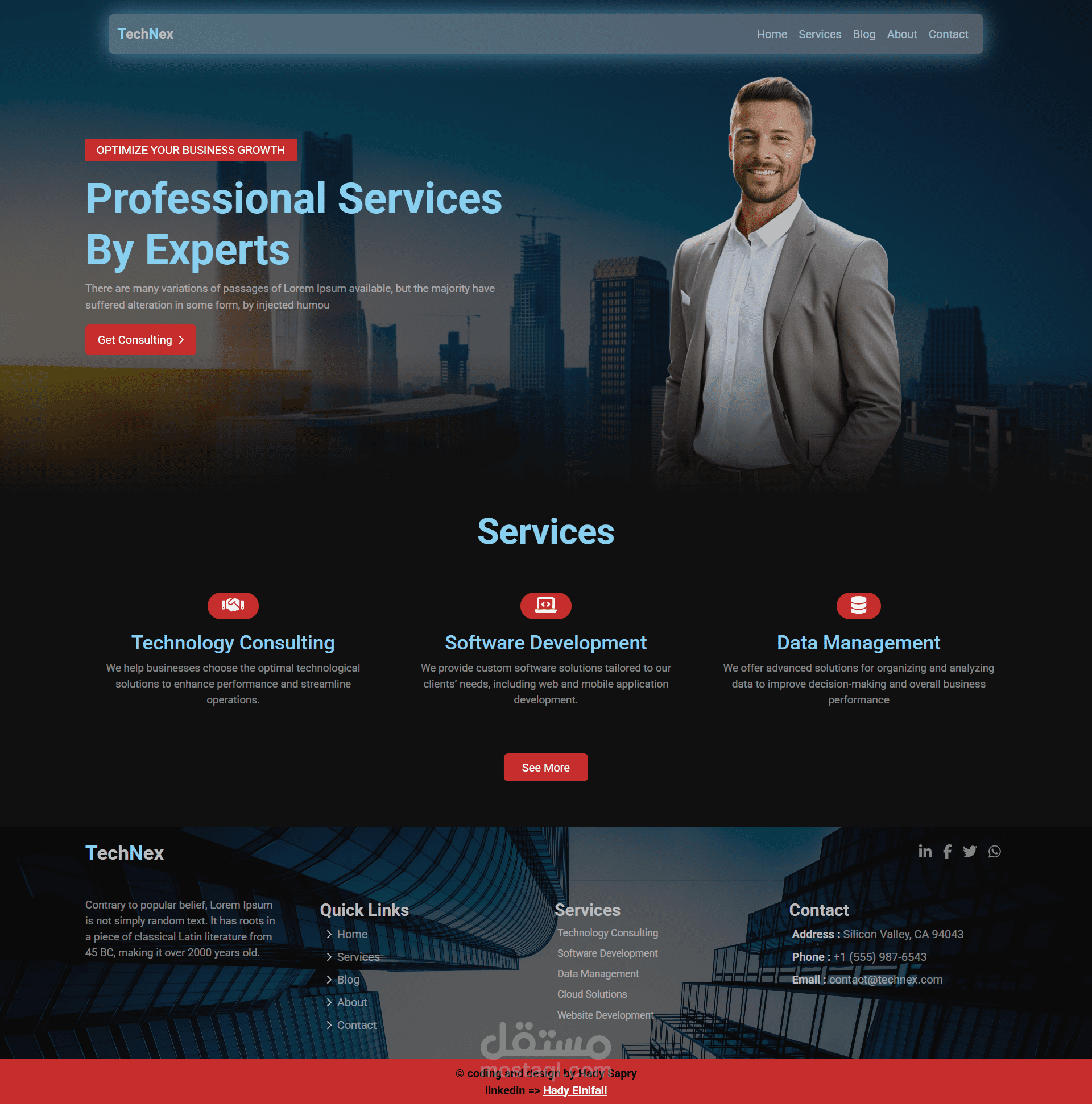 الموقع عبارة عن موقع تعريفي خاص بشركة استشارات في مجالات الاعمال والتكنولوجيا مع اضافة صفحة داخل الموقع لاظهار مقالات الشركة الاخيره مع امكانية فلتره هذه المقالات لاظهار فئات معينه من المقالات واخري لا صممت ونفذت بواسطة React وذلك لسهولة وسرعة التنقل بالموقع مما يمنح المستخدم راحة اكثر عند التعامل مع موقع الشركة مع اضافة بعض الحركة لاضافة الحيوية الي الموقع