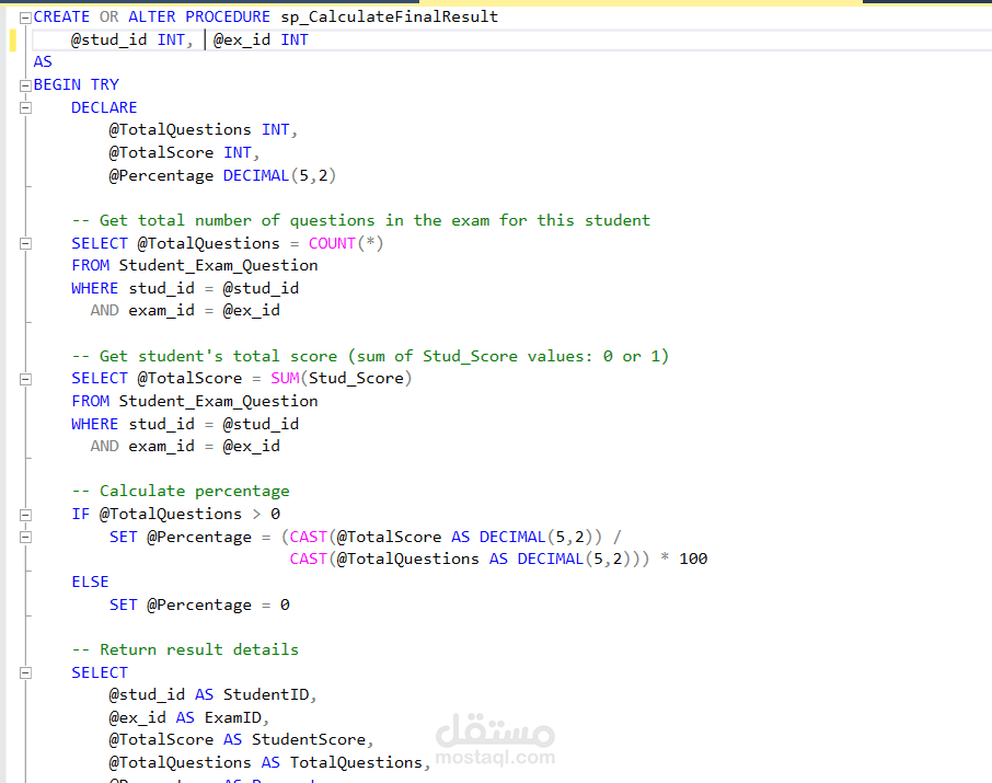 sp_CalculateFinalResult لاستخراج النتيجة النهائية ونسبة النجاح.