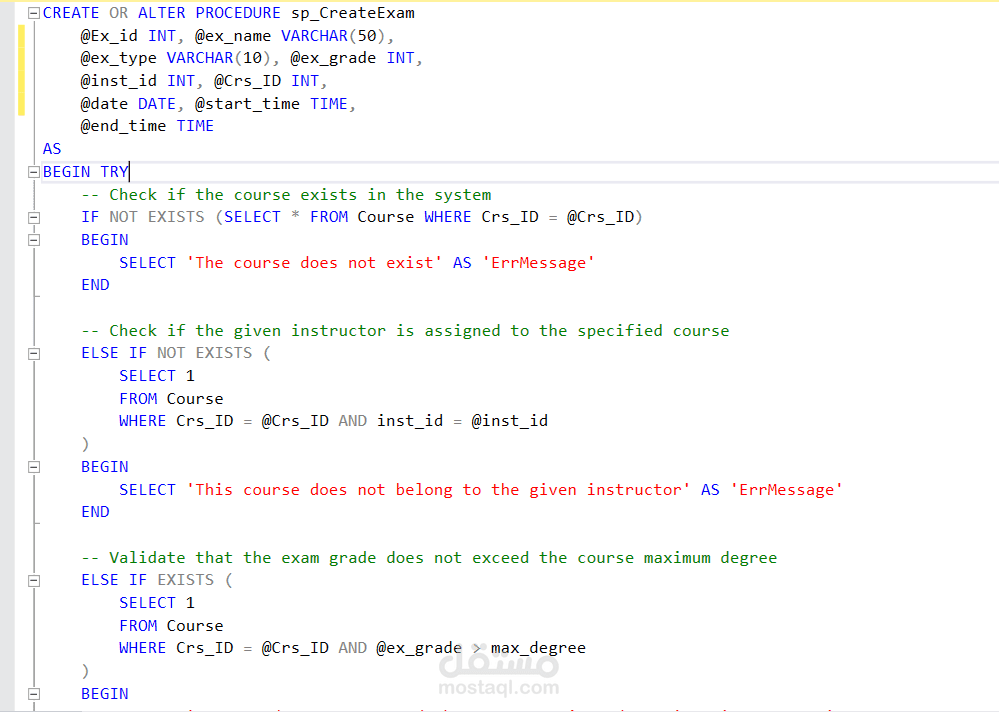 sp_CreateExam لإنشاء الامتحانات مع التحقق من صحة البيانات.