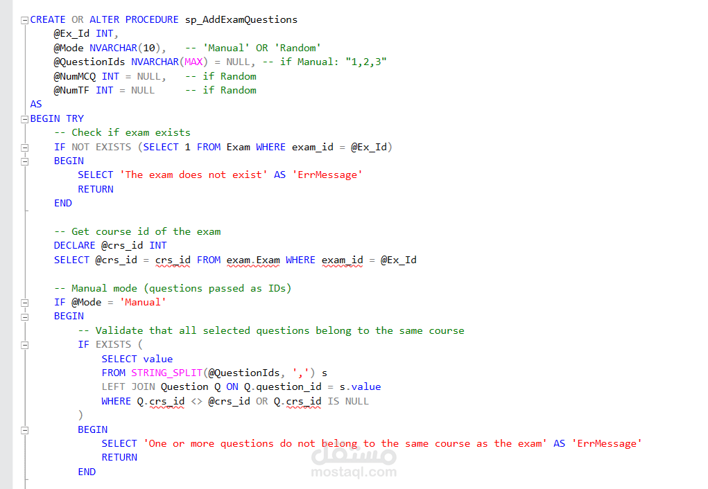 sp_AddExamQuestions لإضافة الأسئلة يدويًا أو بطريقة عشوائية.