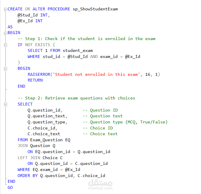 sp_ShowStudentExam لعرض الامتحان والأسئلة مع الخيارات.