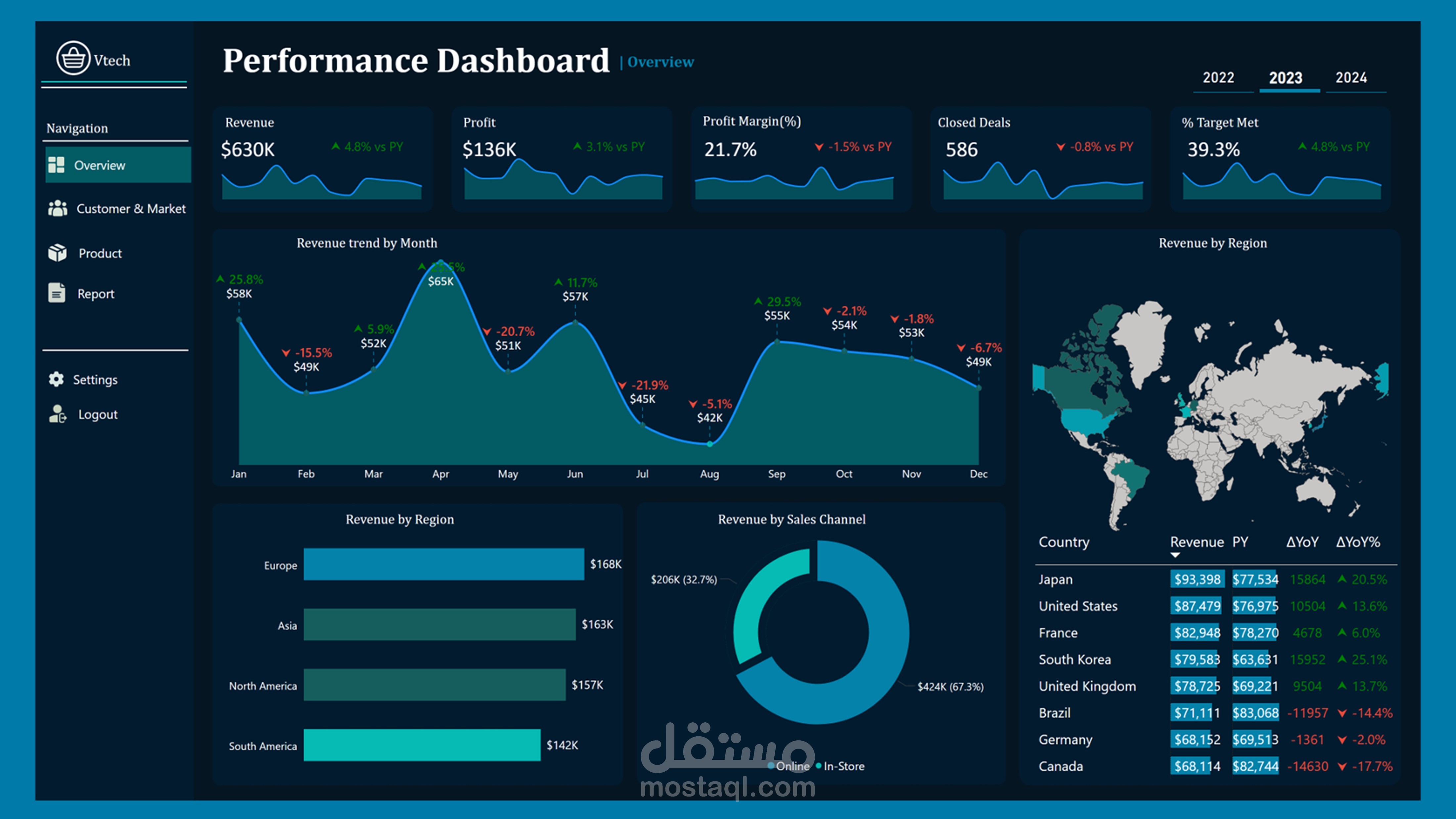 تحليل جغرافي للإيرادات عبر خريطة تفاعلية وجداول توضح أداء كل دولة.