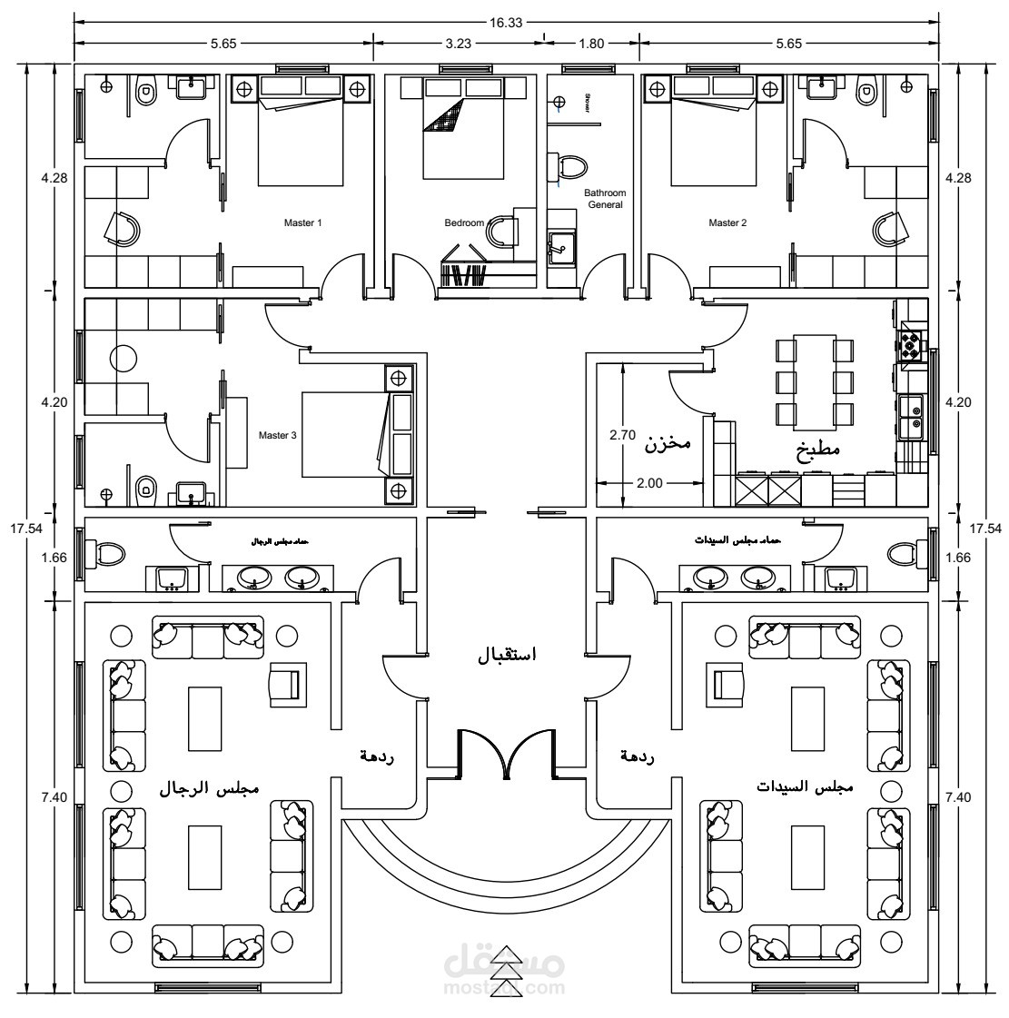 3 غرف ماستر / غرفة نوم رابعة / مجلس رئيسي (رجال) / مجلس نساء / عائلي / مطبخ رئيسي مع مخزن ملحق / حمام عام.