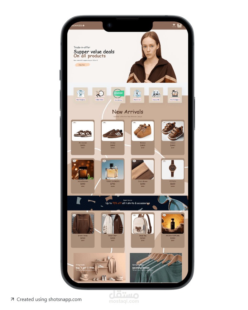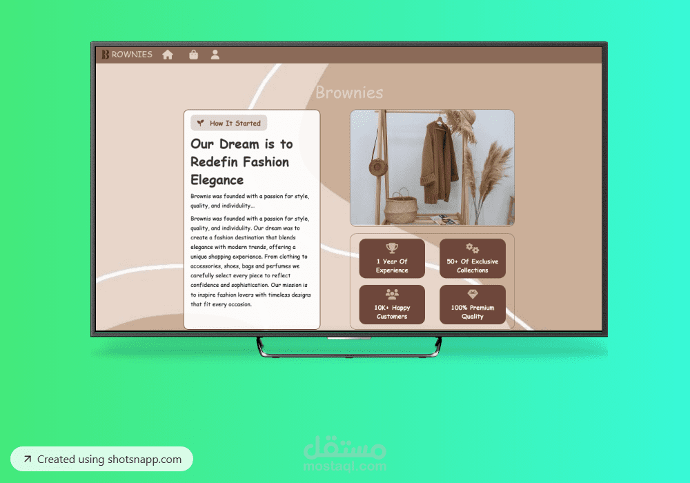 تصميم بصري دافئ: يساهم استخدام اللون البني الدافئ في تصميم الواجهة بتعزيز الهوية البصرية، ليقدم تجربة تسوق راقية ومريحة.