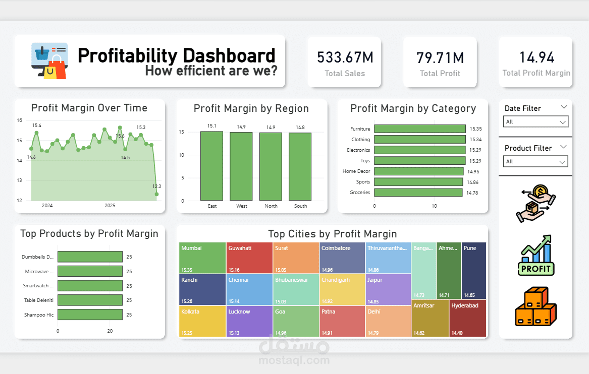 لوحة معلومات الربحية (Profitability Analysis): للتركيز على هامش الربح وتحديد مصادر الربح الحقيقية.