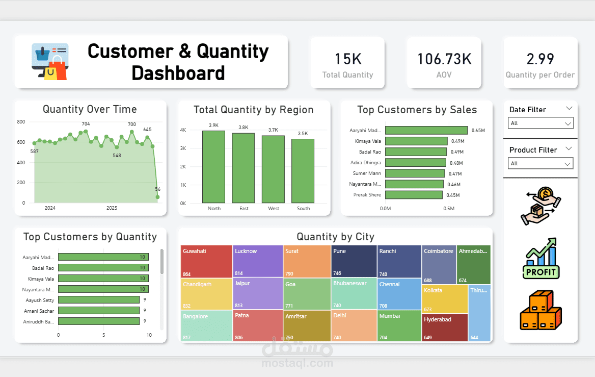 لوحة معلومات العملاء والكمية المباعة (Customer & Quantity Insights): لفهم سلوك العملاء وتحديد شرائحهم المختلفة.
