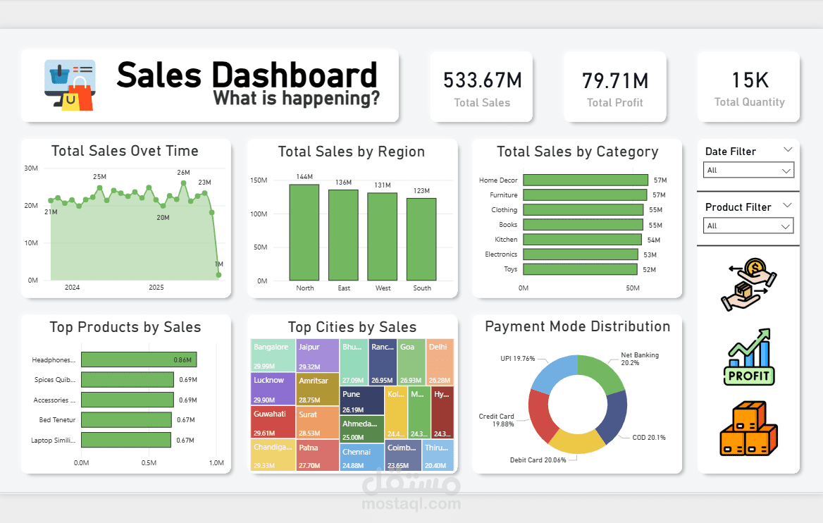 في هذا المشروع، قمت بتحويل بيانات أولية لمتجر إلكتروني إلى لوحة معلومات (Dashboard) تفاعلية ومتكاملة، تقدم قصة كاملة عن أداء المشروع. الهدف لم يكن مجرد عرض الأرقام، بل تمكين أصحاب القرار من فهم "ماذا يحدث؟"، "لماذا يحدث؟"، و"ماذا يجب أن نفعل تاليًا؟".