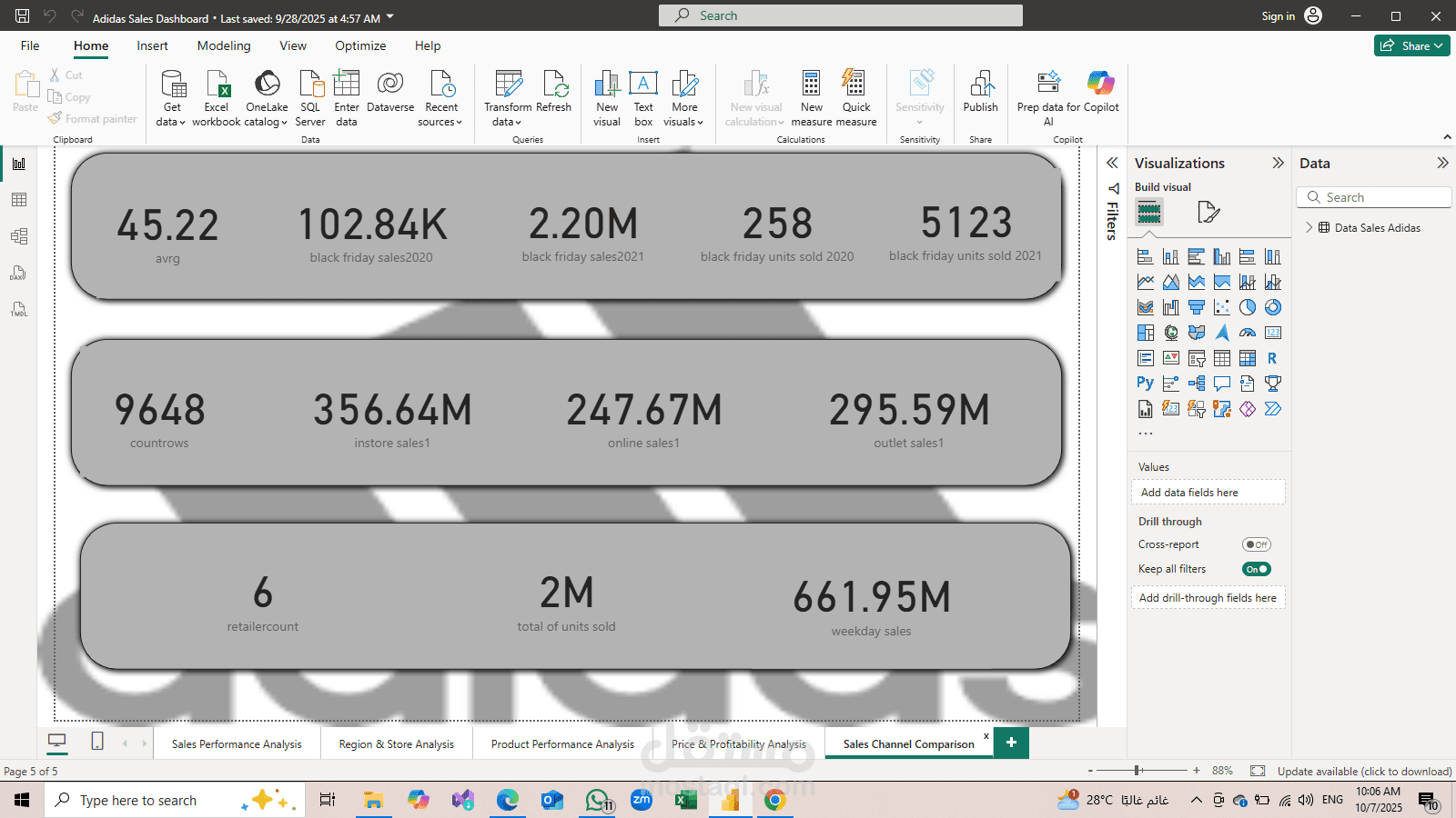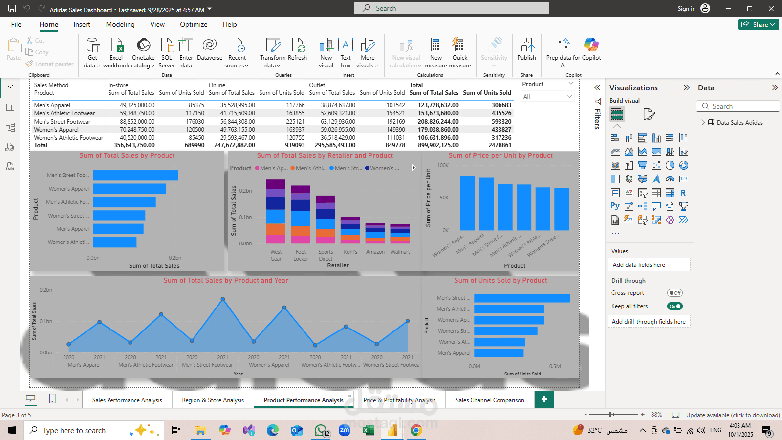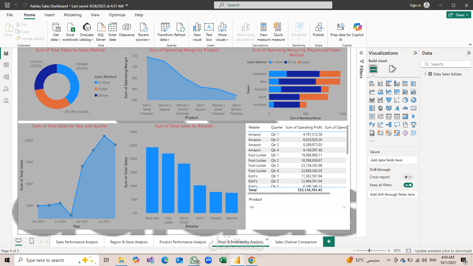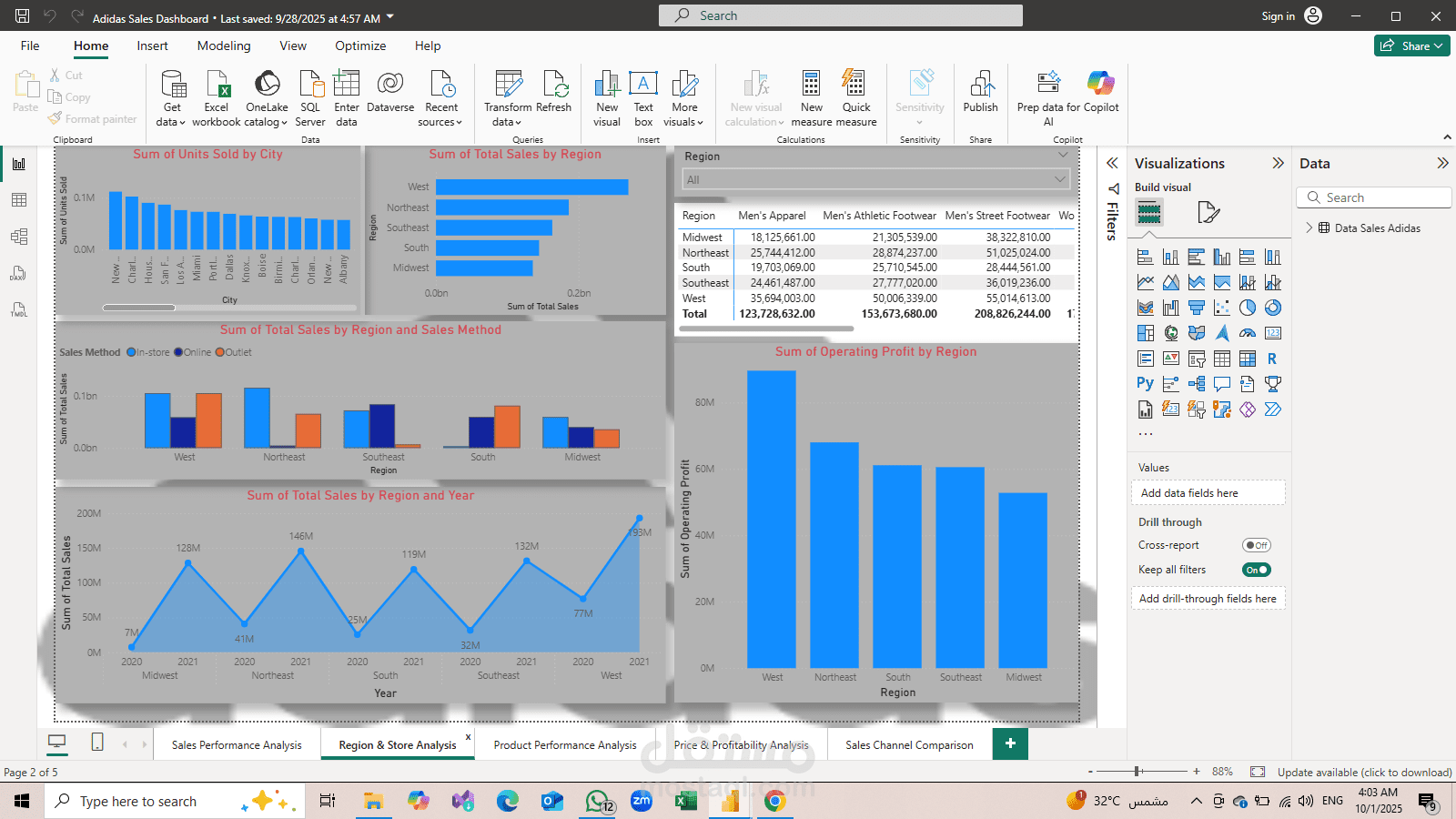 This project provides a comprehensive sales analysis for Adidas using Power BI. It covers multiple aspects including total sales, regional and store performance, product analysis, pricing, and profitability. The dashboard delivers clear visual insights that help identify top-performing products, high-revenue regions, and profitability trends.