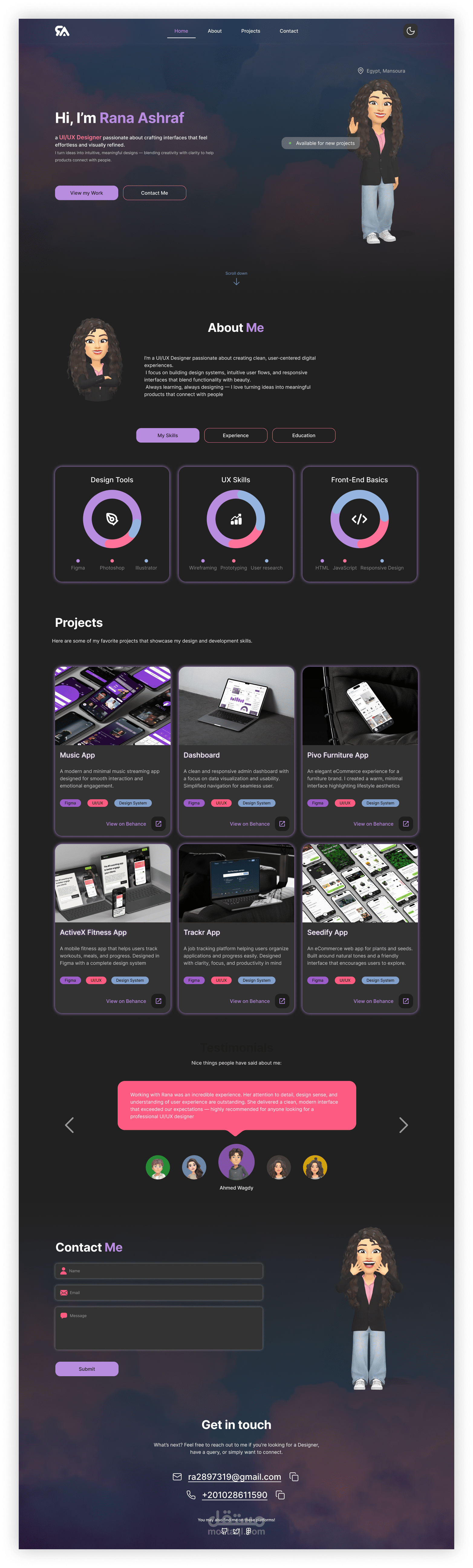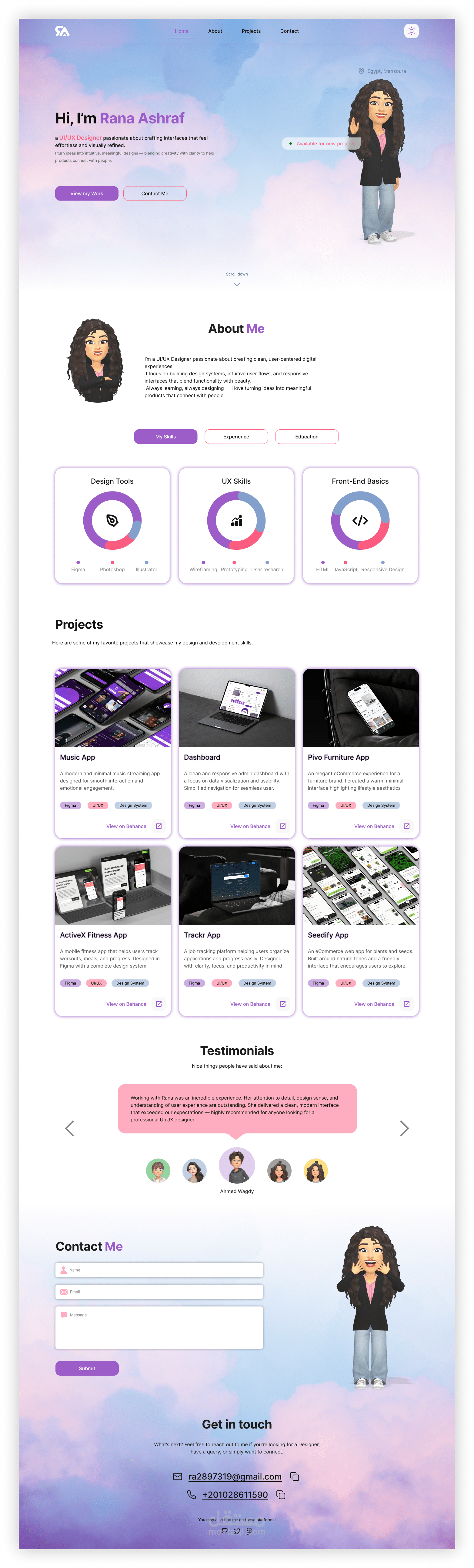 الهدف من التصميم هو إبراز شخصية المصمم بطريقة مميزة وبناء تجربة مستخدم بسيطة، واضحة، وأنيقة على جميع الأجهزة.