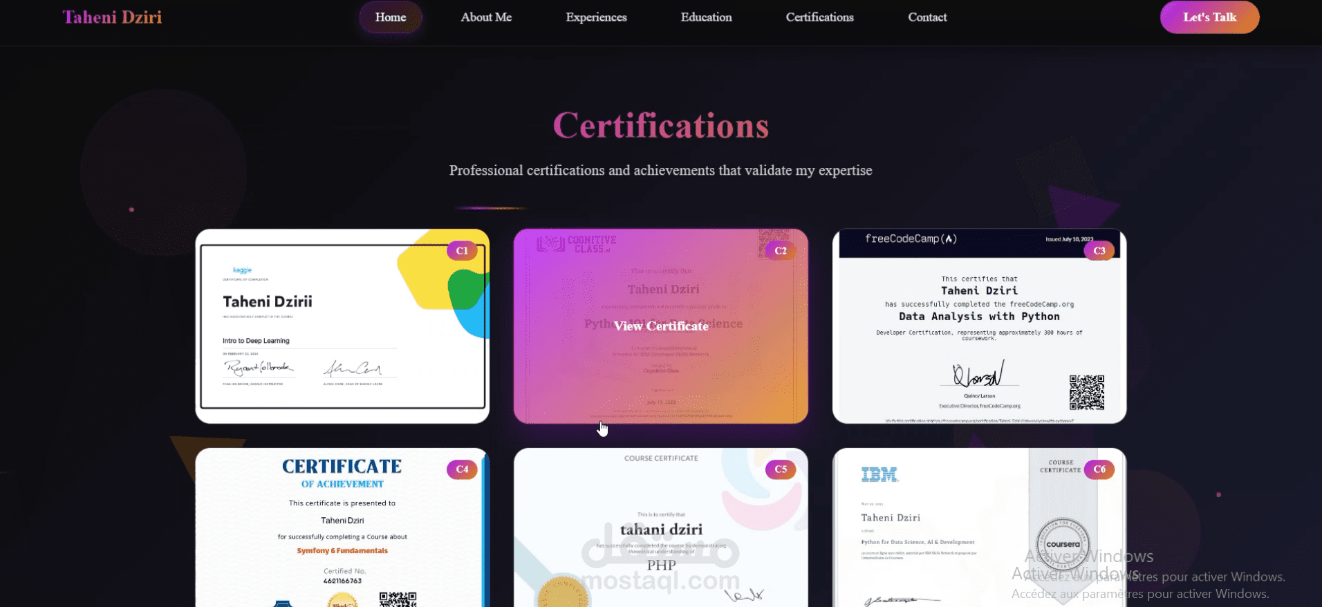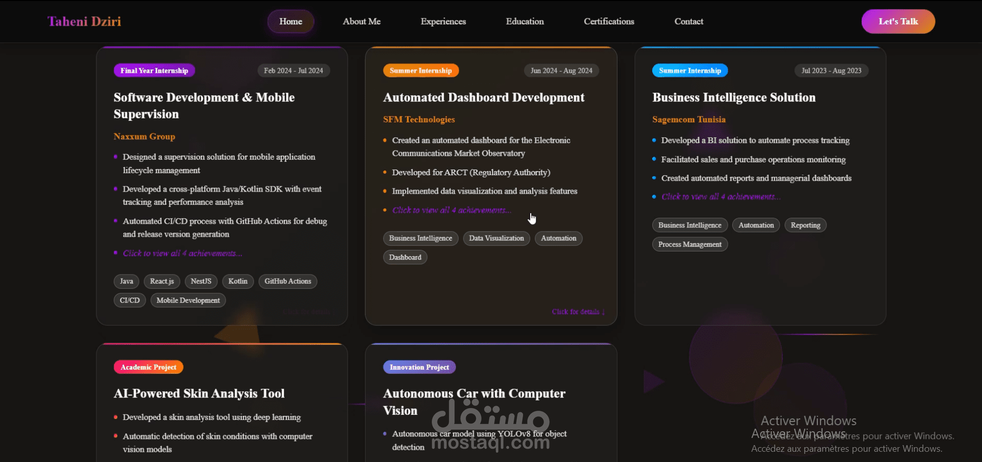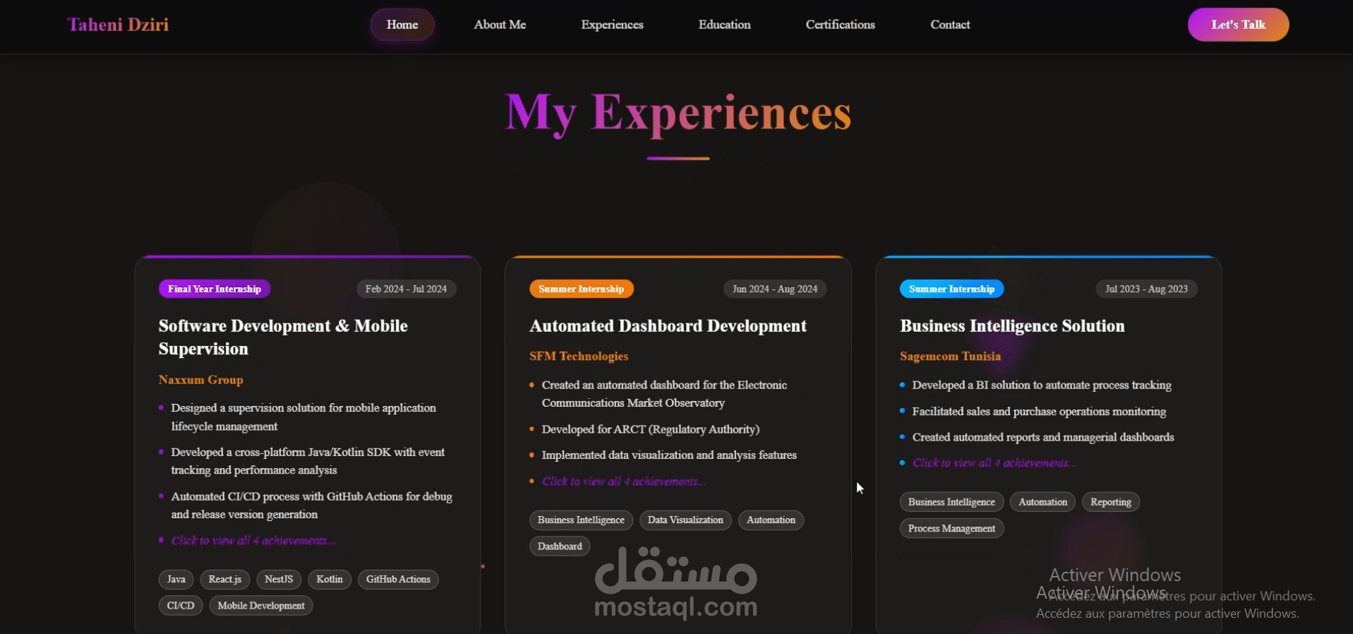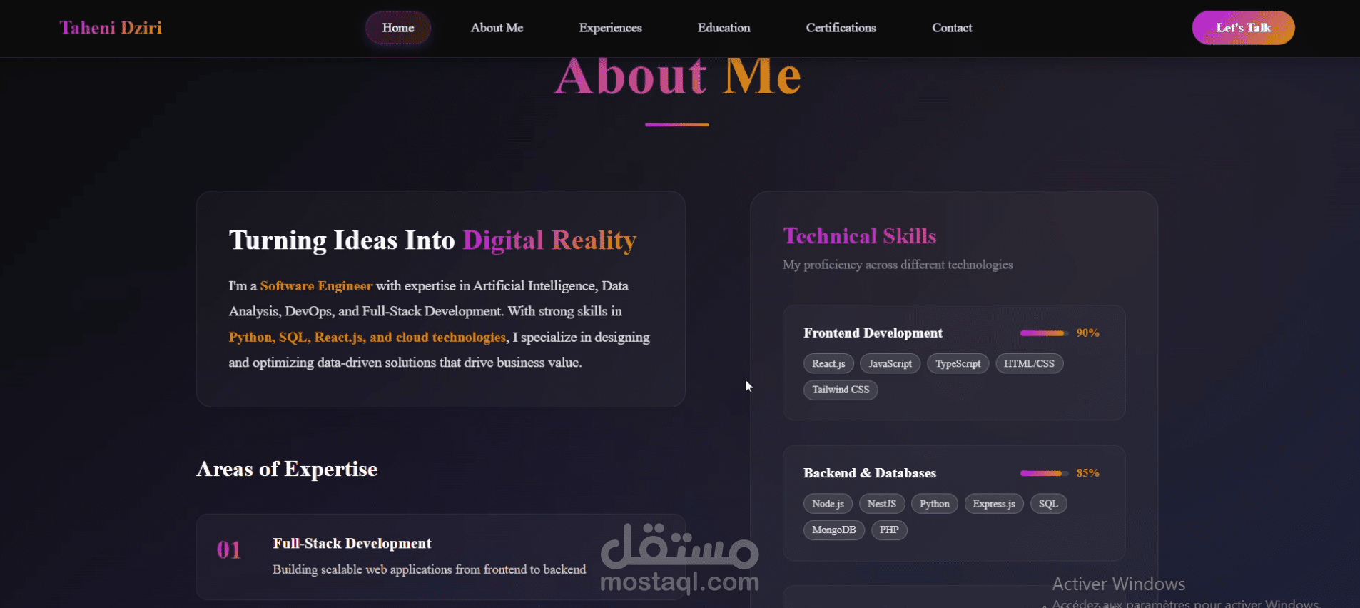 يحتوي الموقع على أقسام مثل: نبذة عني، المهارات التقنية، المشاريع، الشهادات، والخبرة المهنية، بالإضافة إلى إمكانية تحميل السيرة الذاتية والتواصل معي.