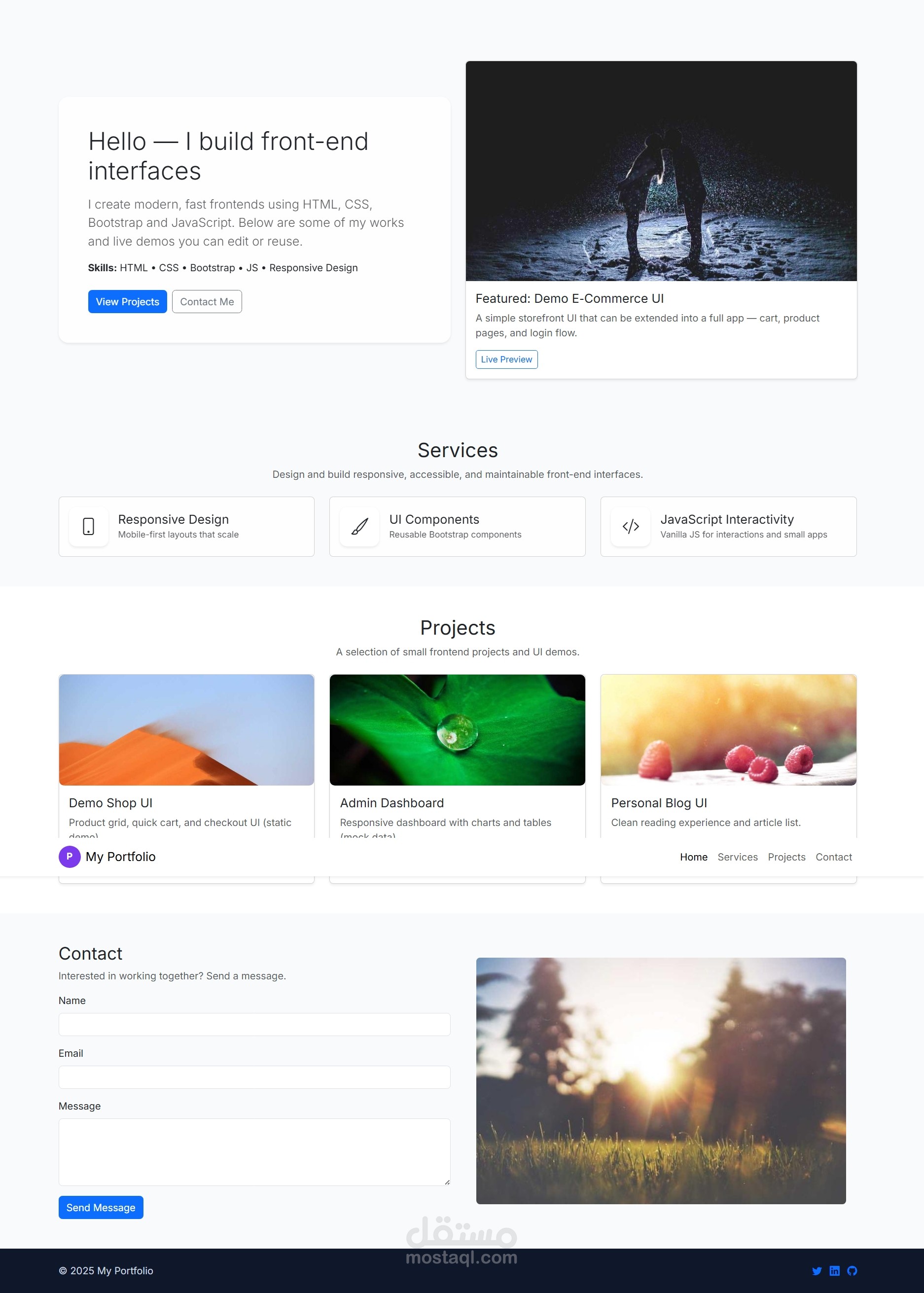المشروع عبارة عن موقع بورتفوليو شخصي تفاعلي تم تصميمه وتكويده باستخدام HTML وCSS وBootstrap وJavaScript.