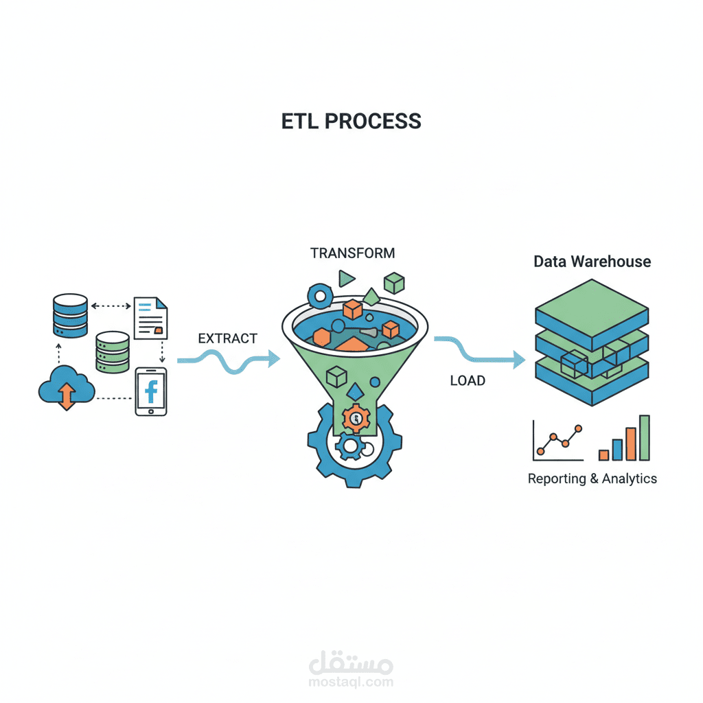Extract: جلب بيانات من مصادر متعددة (ملفات، قواعد بيانات، أو APIs).