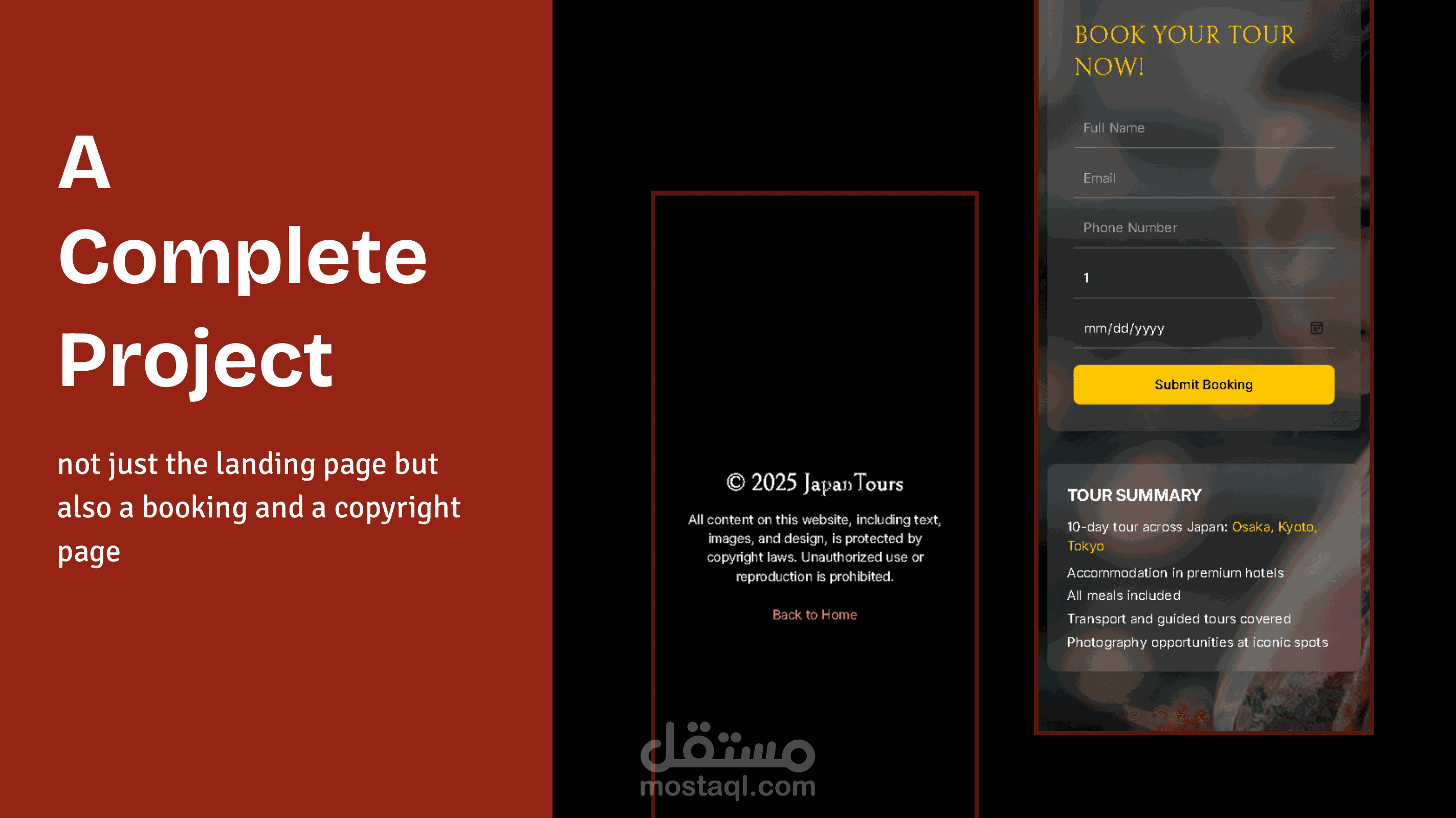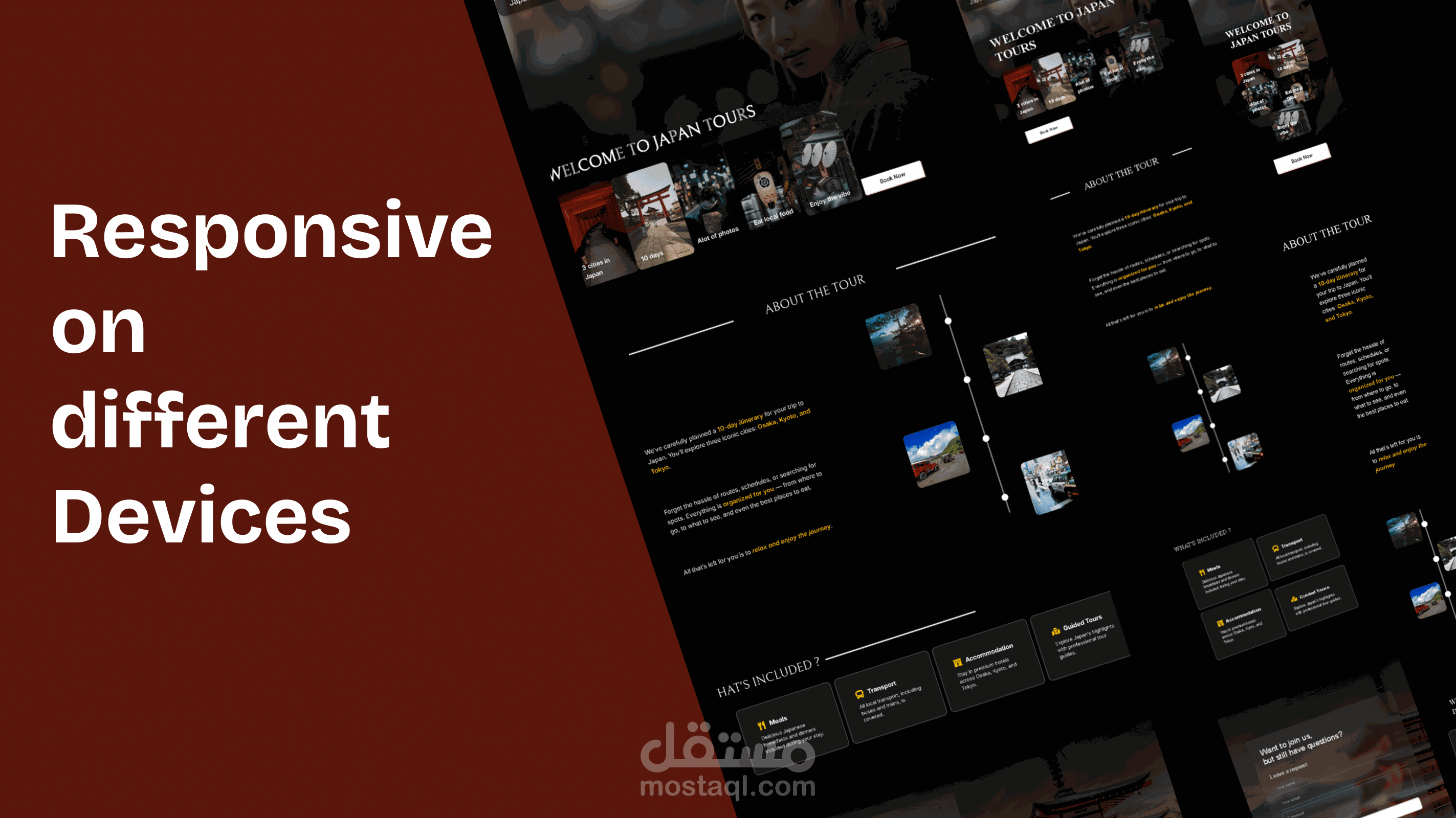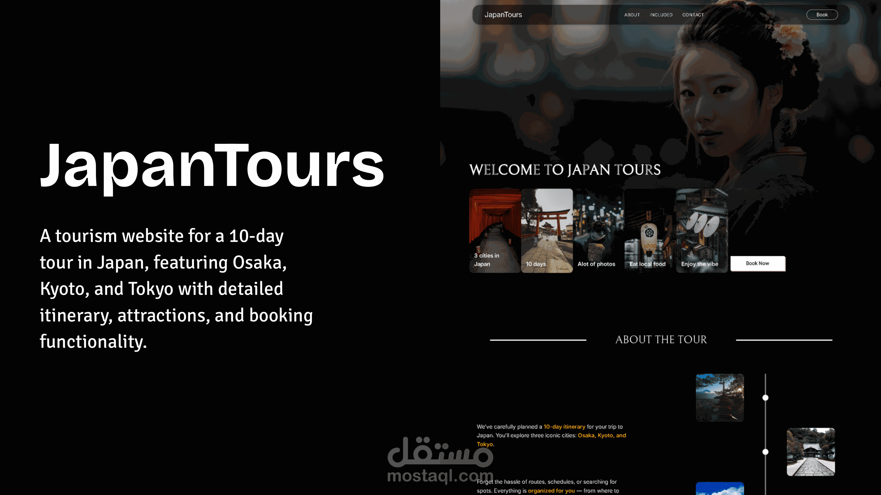 صفحة هبوط لموقع سياحي لرحلة مدتها 10 أيام في اليابان، تشمل أوساكا، كيوتو، وطوكيو، مع تفاصيل شاملة حول المعالم السياحية وخاصية الحجز.