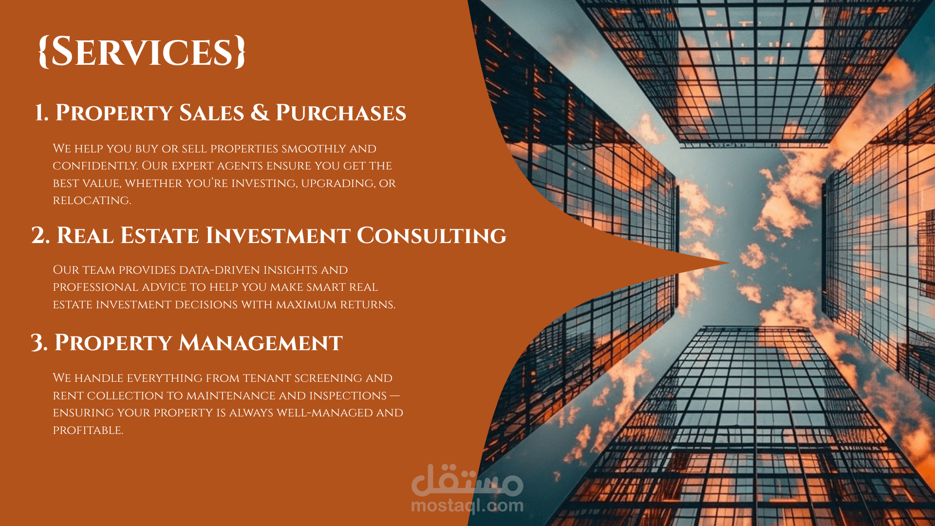 قسم الخدمات (Services): يعرض بوضوح الخدمات الأساسية مثل البيع والشراء، الاستشارات الاستثمارية، وإدارة العقارات.