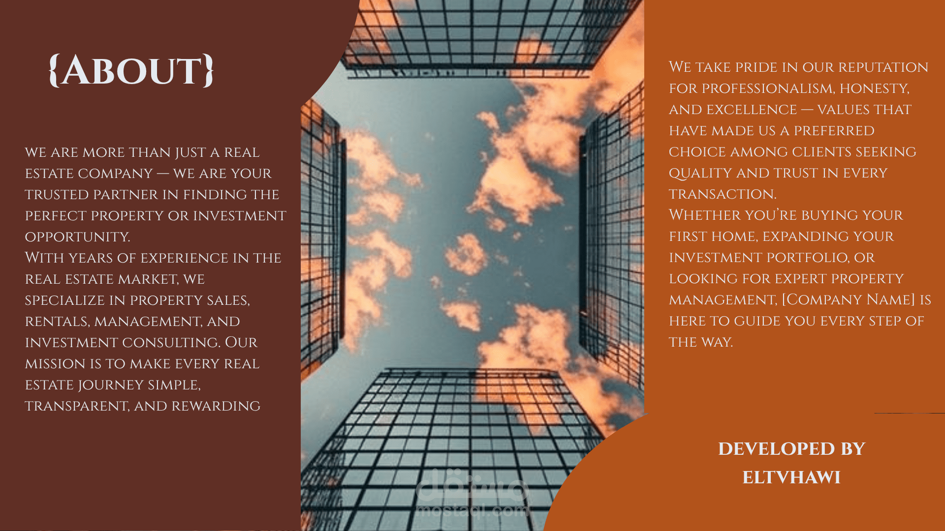 تصميم عصري ومبتكر: تم توظيف عناصر بصرية ديناميكية وأشكال انسيابية تمنح الموقع مظهرًا فريدًا يميزه عن المواقع العقارية التقليدية.