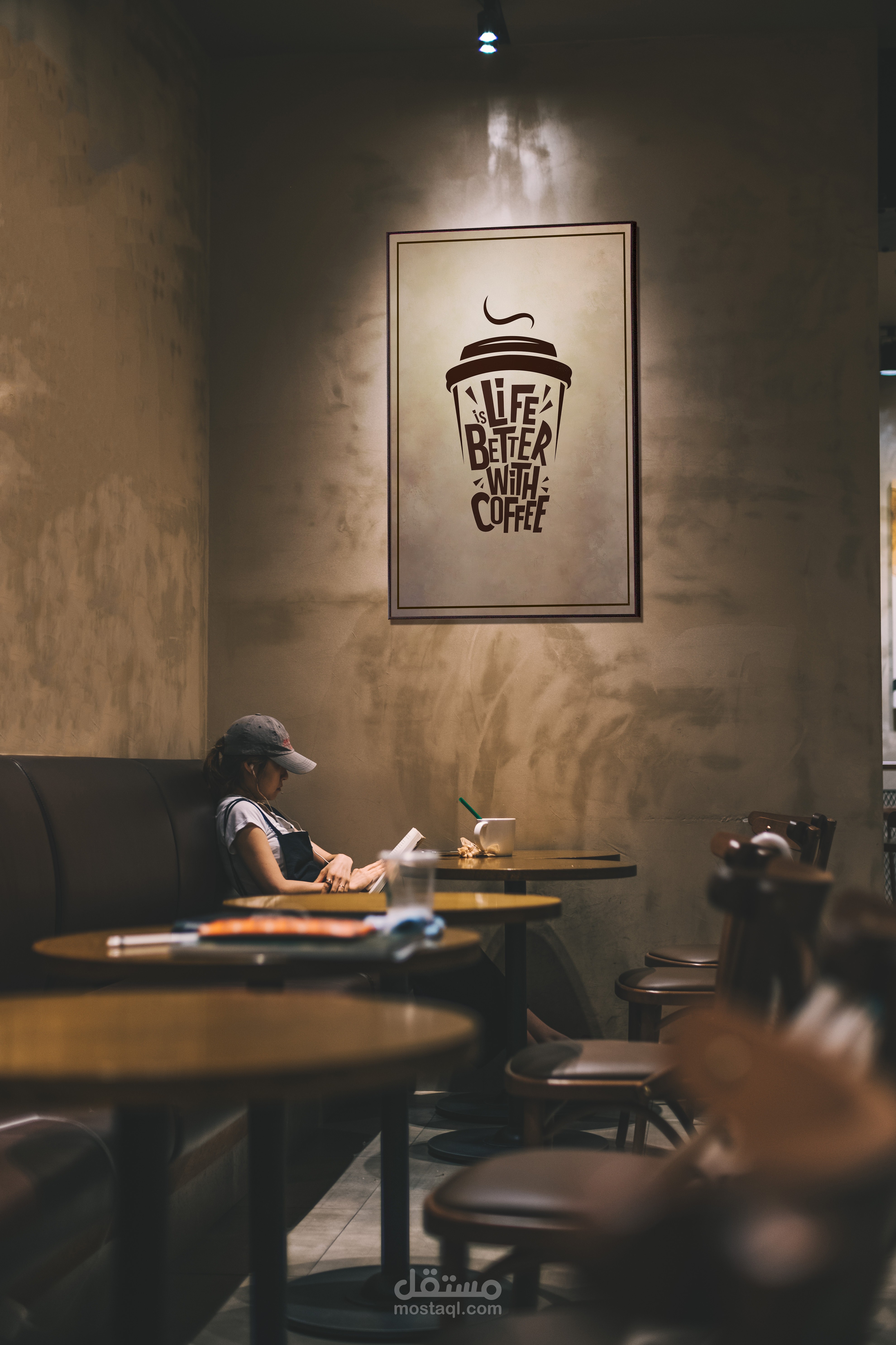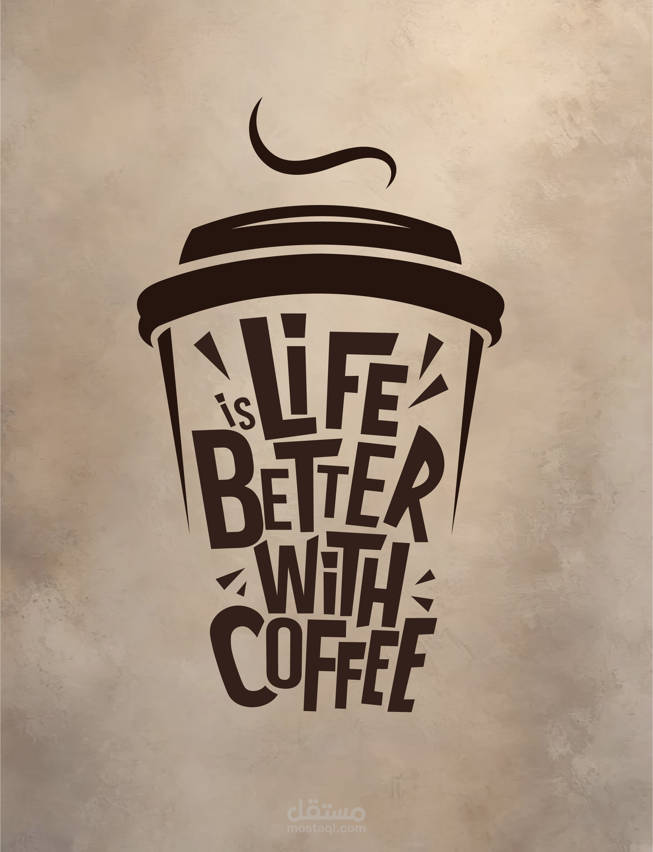 The artwork blends creativity and warmth, using rich brown typography and a background textured with soft beige and coffee stains — evoking the cozy atmosphere of morning brews. Perfect for café entrances, coffee shop interiors, or lifestyle branding visuals.