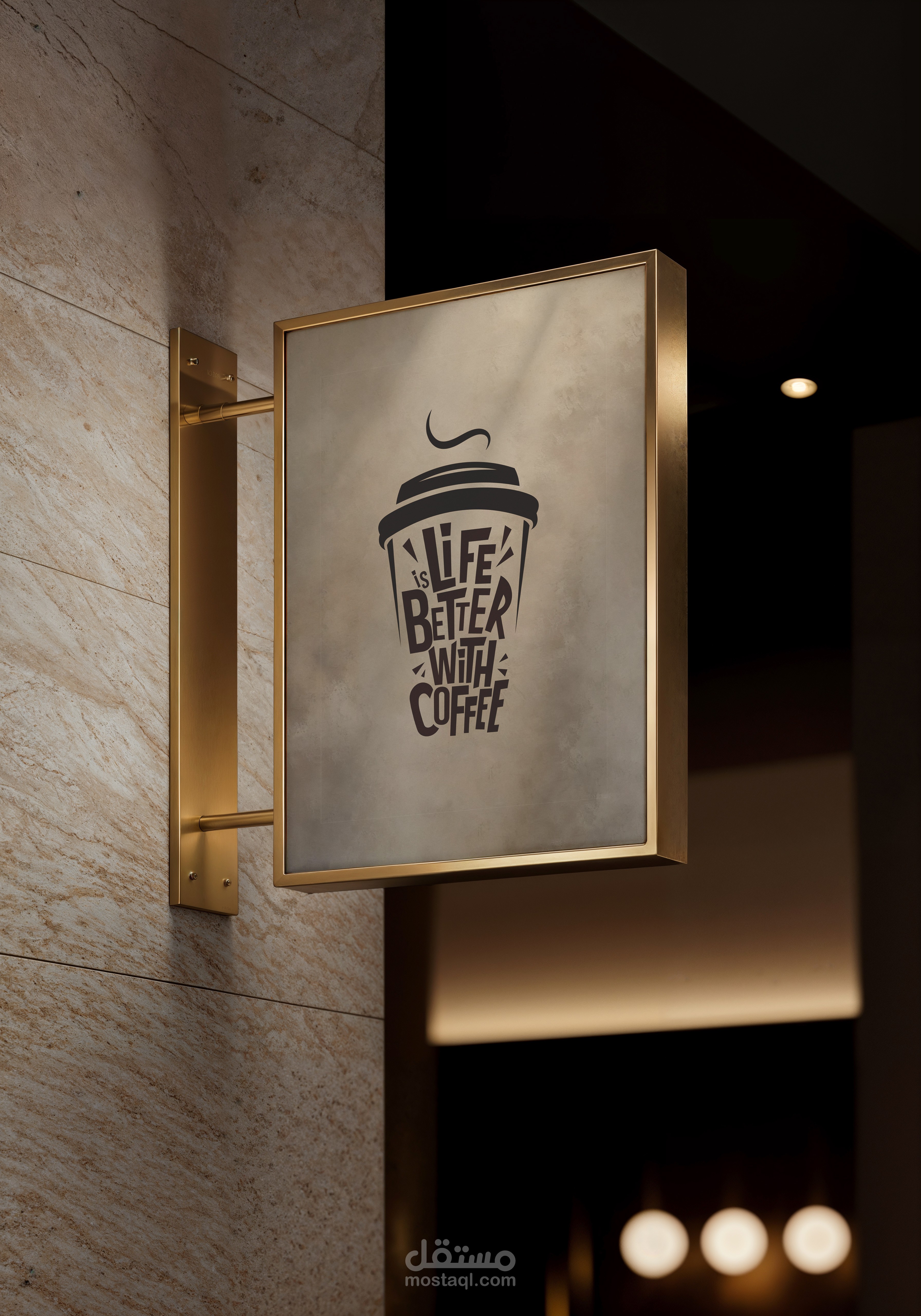 تصميم تايبوغرافي على شكل كوب قهوة يحمل عبارة “الحياة أجمل مع القهوة.”
