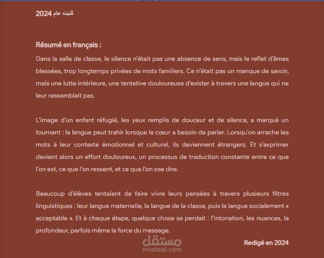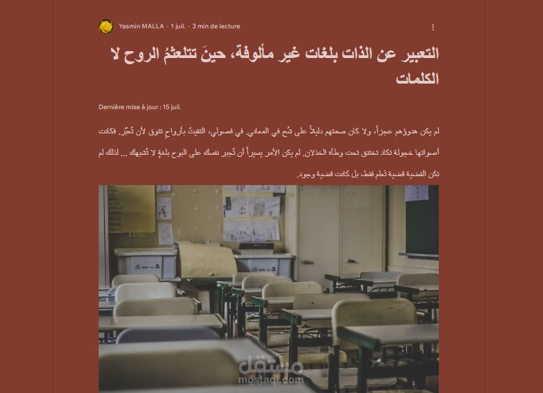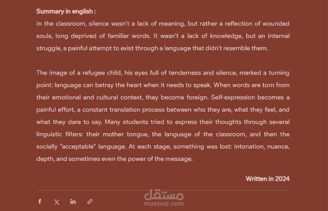 أقدم هذه المقالة التي تسرد تجربتي الإنسانية في صف تعليمي يضم طلابًا لاجئين وغير لاجئين، حيث تتناول بعمق تحديات لغوية وثقافية، وكيف تتحول اللغة أحيانًا من جسرٍ يصلنا إلى جدار يعزلنا. أحاول من خلال هذه المقالة أن أوضح أن التلعثم ليس ضعفًا، بل هو بصمة صراع داخلي مع الصمت، وأن الطلاقة اللغوية لا تعني الانتماء دائمًا، كما أن التلعثم لا يعني الغربة بل هو تعبير عن نضال صامت. وأؤكد على أن استخدام اللغات الأم ليس ترفًا بل ضرورة حيوية تعكس عمق التعبير والذات.