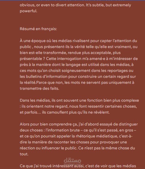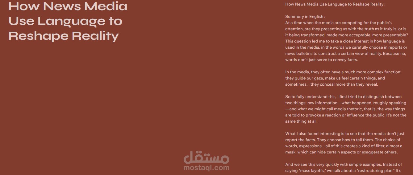 هذا المشروع هو عرض شرائح من تصميمي وتحليلي، أتناول فيه كيف تُستخدم اللغة الإعلامية كأداة لإعادة تشكيل الواقع في أذهان الجمهور، من خلال التكرار، الاصطلاحات، الانتقاء، واللغة الانفعالية.