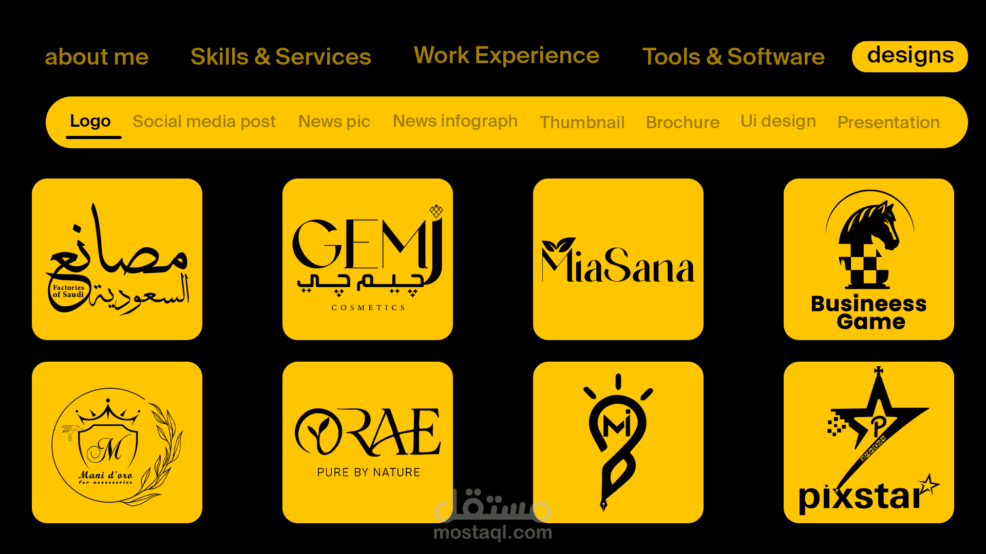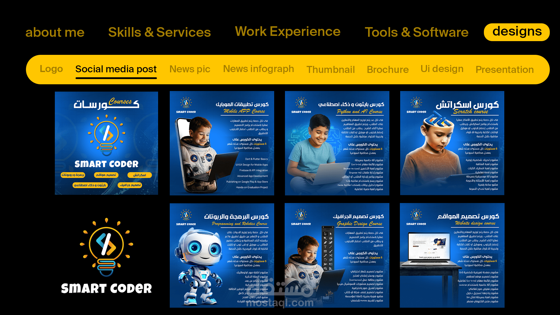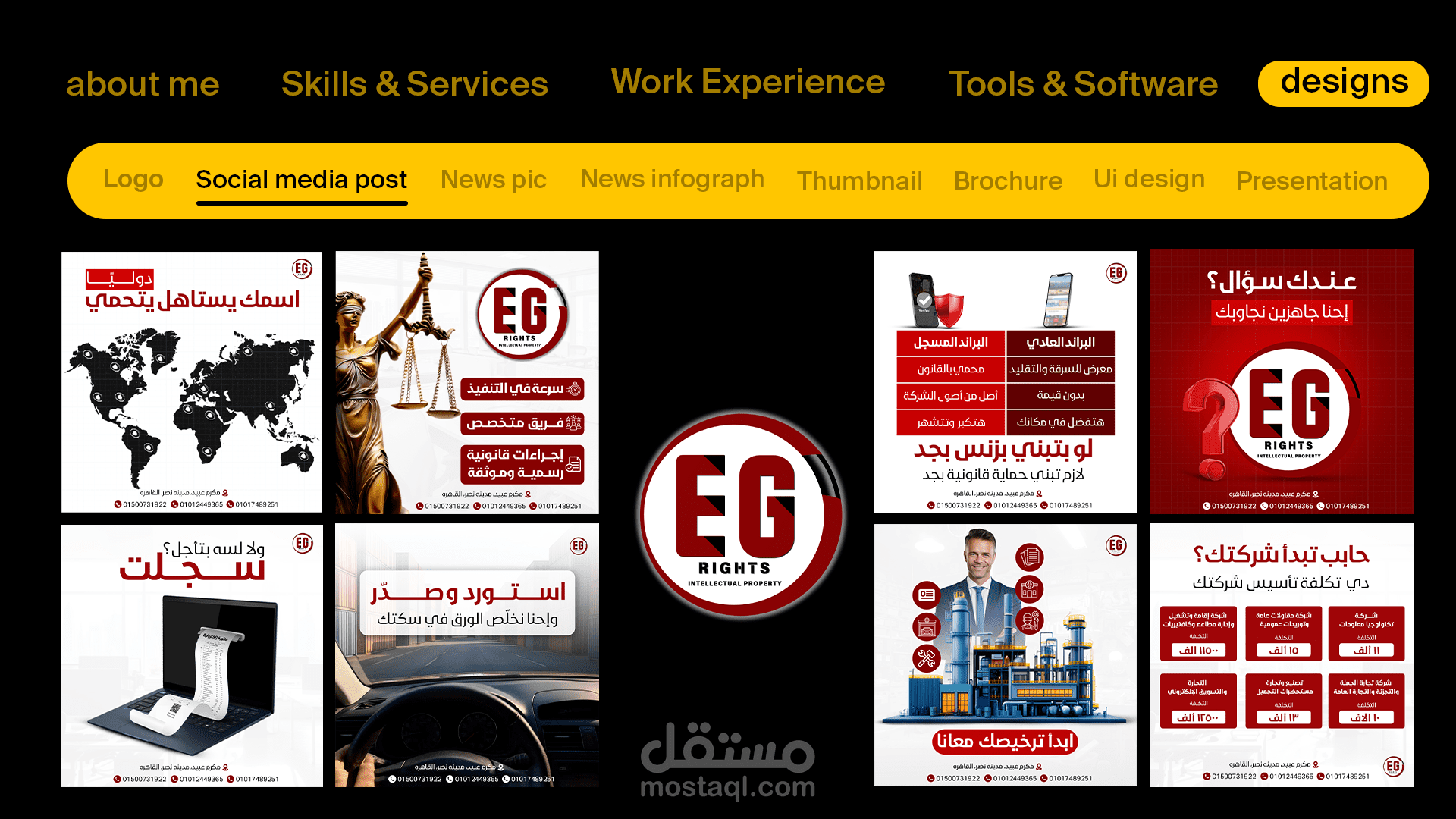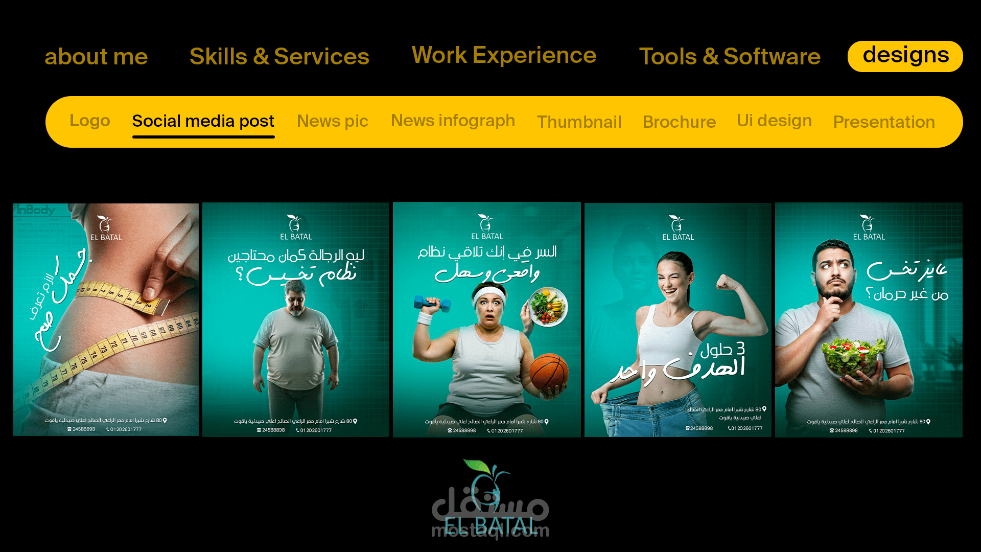 My portfolio includes social media designs in various fields, thumbnail designs, logos, and user interface designs.